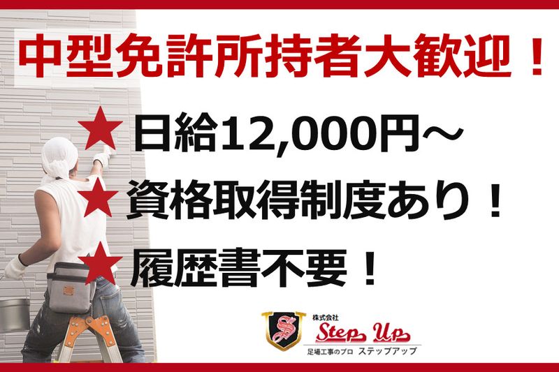 【アピールポイント】 足場スタッフの募集 ※中型免許必須※前職給与考慮※ ■資格取得支援制度あり ■面接なし・履歴書なし・電話のみで即内定 ■積み込み部隊により負担減 ⭕電話での簡単な面談で採用を決定!お気軽にご応募ください。 ■電話からのご応募・お問い合わせ 株式会社Step Up TEL:042-705-6892 受付時間 8:00~17:00の間にお願いします。 平日夜間の面談、相談可能です。