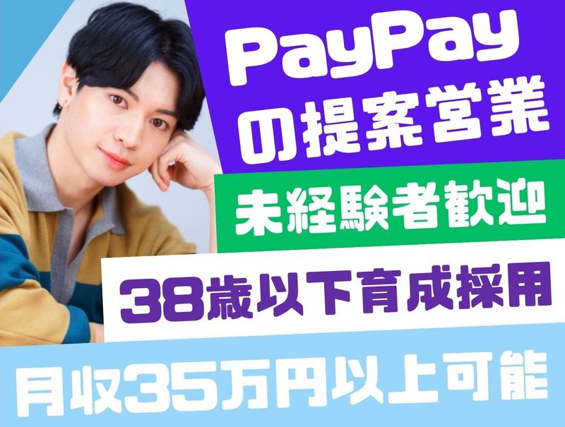 仕事内容 <38歳以下限定採用><未経験歓迎!人柄採用><年休120日以上、完全週休2日制><月収35万円以上可能>あなたが普段使っているPayPay、もっと色々な場所で使えたら良いと思いませんか?そんなPayPayサービスの導入をご提案するお仕事です♪ \ ここに注目! / ◎ド未経験歓迎!社会人デビューもOK ◎充実の研修制度でしっかりサポート ◎転勤なし♪地元で長く働けます ◎引越し支援制度あり、UIターン歓迎 ◎月給26万円以上スタート+インセンティブ ◎年間休日120日以上、完全週休2日制 ◎産前産後休暇など嬉しい待遇たくさん♪ ―――――― 仕事内容 ―――――― キャッシュレス決済サービスPayPay導入を 新規加盟店へ企画提案する営業職です。 圧倒的知名度を誇る決済サービスのため、 「話を聞きたかった」とお客様も興味津々。 メリットだけでなくデメリットもお伝えし、 ご納得いただけるよう提案してください。 なによりも信頼を得ることが大事です! 《 提案先例 》 飲食店、小売店、美容サロン、 アパレルショップなど中小企業が中心。 《 この仕事のやりがい 》 誰もが使いやすい決済手段を 世の中に普及させる役割を担えます。 企業や店舗様の運営に貢献でき、 担当者から感謝の言葉をいただけることも。 さまざまな顧客とのやり取りを通じて 自分自身も成長していけることも この仕事ならではのやりがいです。 ――――――――― 入社後はまず… ――――――――― 入社後研修の他に拠点での研修あり。 先輩のサポートから始めて、 徐々に業務を覚えていける環境です。 また提案資料や契約書は 全て電子化していますので、 荷物がかさばることもなし! 提案~受注までiPad1台で完結します。 ――――――――――――― 将来はコンサルに挑戦! ――――――――――――― 導入いただいたお客様は既存顧客として 長くお付き合いいただく関係に。 アフターサポートや運用方法の提案など、 コンサルティング要素のある業務も 担当していただきます。 コンサルタントや自走できる営業は どの業界でも需要が高く、 将来の選択肢が広がります。 ―――――――――― キャリアについて ―――――――――― 社歴や年齢・性別に関係なく、 チームを纏めるリーダーや課長、 部長などの管理職を目指せます。 他部署へのジョブチェンジや 自身で組織を立ち上げることも可能。 さまざまなキャリアを描けることも 当社の魅力のひとつです。 転職をすることなく 「やりたい!」と感じたことを 実現していける自由度の高い会社です。