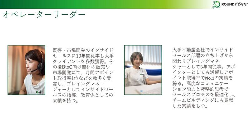 仕事内容 規模さらに拡大のため、増員いたします。 9:00~20:00のサービス時間でフルタイム勤務・パートタイム勤務同時募集 \時給2,000円も目指せる★フルリモート勤務!/ 柔軟なシフトでプライベートと両立もできます!《土日入れる方優遇♪》 不動産インサイドセールスBPO「楽トス」オペレーター募集です。 私たちのサービス「楽トス」https://roundtoss.com/ 不動産仲介会社や建築会社などで多い悩み。それは問合せ対応です。 不動産ポータルサイト(SUUMO・HOME'S等)からのお問い合わせ顧客に対して電話をかけ、不動産会社と顧客のアポイントを調整し取得するお仕事です。 マニュアル・トークスクリプトあり。約1ヶ月かけて丁寧な研修もあるので安心して始められます!業務はすべて在宅で行っていただきますのでご自身のライフワークも計画しやすいです。 ■主な業務内容 ・メールでお問い合わせがあった顧客への電話対応 ・状況ヒアリングとアポイント獲得 ・不動産会社への情報連携(LINE) ・業務報告の入力(簡単なPC操作) ※反響のあるお客様への対応が中心です ※在宅でもチームでフォローし合う体制があります 現在ROUNDTOSSは拡大フェーズ。 オペレーターで終わらないキャリアを本気で用意しています。 将来的には ・リーダー ・SV(マネージャー) ・カスタマーサクセス(クライアント対応) ・バックオフィス統括 ・社員登用 へのステップアップが可能です。 5月には新システム導入予定。 業務効率が向上し、より“価値を出す仕事”に集中できる環境になります。 ■なぜ在宅でキャリアアップができるのか 私たちは考えました。 キャリアアップに本当に必要なのは、「出社」ではなく「成果と姿勢」ではないか。 地方在住、家庭の事情、ライフステージの変化。 能力があっても、環境で止まっている方が多くいます。 だから私たちは、 ・数値で可視化される評価制度 ・役職候補育成プログラム ・コール診断と個別フィードバック ・明確な昇格基準 を整えました。 場所ではなく、実力で昇格できる仕組みです。 住む場所に縛られず、キャリアを築きたい方。あなたの挑戦を、心からお待ちしています。