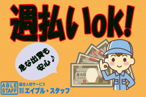 インフォメーション 月収28万円以上可!高時給1500円!未経験歓迎、週払いOK、土日祝休み! 摂津市での製造のお仕事です!高時給1500円よりスタート! ※昇給あり ・仕事経験の少ない方でも大歓迎 ・友人同士の応募もOKです ・週5日でガッツリ働ける方大歓迎 ・正社員登用の実績あり! ・交通費全額支給あり(規程) <50歳未満の方(例外自由3号、長期勤続によるキャリア形成のため) > エイブル・スタッフは製造系のお仕事もご紹介いたします アピールポイント エイブル・スタッフは製造系のお仕事もご紹介いたします 自分力バロメータ 柔軟性