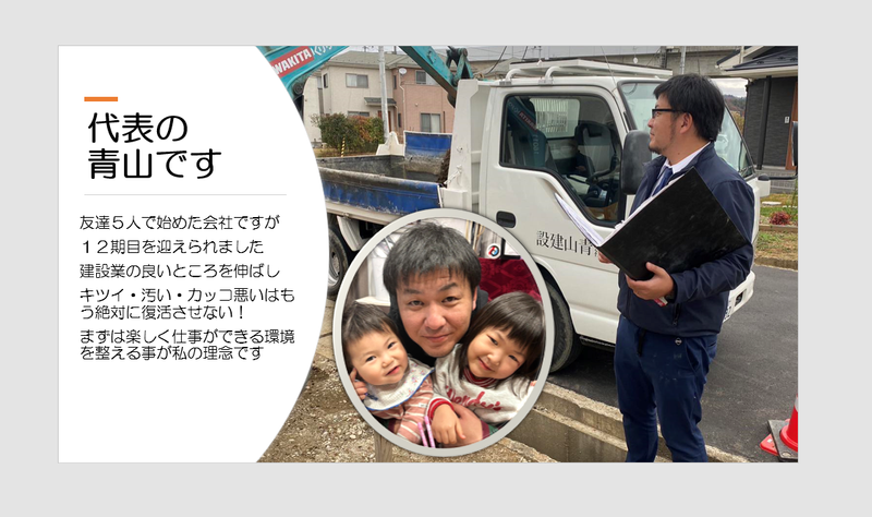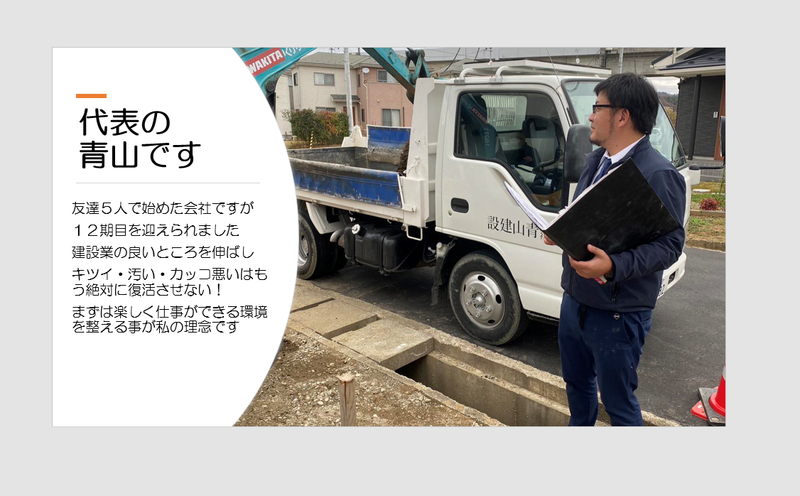 仕事内容 「建設業って、キツくて、汚くて、ダサいんでしょ?」 そんなイメージをひっくり返したくて、僕たちは立ち上がりました。 手に職をつけて、ちゃんと稼いで、胸を張れる仕事をする。 それが青山建設の現場です。 具体的には、以下のような工事を行います。 ◯ 道路工事 街中のアスファルト舗装や縁石工事、擁壁づくり、下水管の設置など。 重機を操作して、街のインフラを自分たちの手で整えていく仕事です。 ◯ 足場施工 建物の周囲に安全な足場を設置する仕事。 インパクトやハンマーを使って部材を組み上げ、最後に布をかぶせて仕上げます。 ◯ 解体工事 重機で大まかに壊し、手元作業で細かく丁寧に解体。 ダンプでの搬出などもチームで連携しながら行います。 ◯ 法面成形(のりめんせいけい) 土砂崩れを防ぐため、山の斜面を整える仕事。 災害を未然に防ぐための、大切な社会インフラ工事です。 【1日の流れ】 現場の基本ルーティンは以下の通り。 無理なく働き、集中できる時間管理を徹底しています。 8:00 現場へ到着 10:00 15分休憩 12:00 昼休憩(60分) 15:00 15分休憩 17:30 業務終了 【未経験者の育成フロー】 ステップ① 初月 掃除や水巻きなど、現場の空気を知るところから。 用具の名前、現場の流れを丁寧に教えます。 ステップ② 2ヶ月目以降 先輩の助手として、実作業を一緒に経験。 資格取得もサポート(費用補助あり) ステップ③ 1年目以降 あなた自身がチームを持ち、職人として活躍。 やりがいも年収も、どんどん上がっていきます。