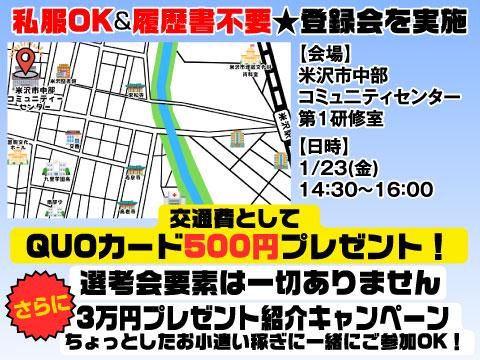【保険制度】 雇用保険、労災保険、健康保険、厚生年金 待遇・福利厚生 【福利厚生】 ・社会保険完備(初日から加入) ・正社員登用制度 ・週払い制度あり ・交通費支給(ガソリン代も含む/規定あり) ・有給休暇あり ・食堂、駐車場あり ・制服貸与 ・研修制度あり ・友人紹介手当あり(3万円/規定あり) 【1月入社限定】つなぐ。手当(就業サポート支援金)最大5万円 ※採用枠の方限定 ※各種規定あり ■私服OK・履歴書不要の登録会■ 仕事内容の説明を中心とした案内です。 応募前に内容を確認できます。 ◎ 担当者とざっくばらんに話せます ◎ 仕事帰りの私服OK・手ぶらでOK ◎ 所要時間:約1時間(履歴書持参なら30~40分) ★ 参加特典:QUOカード500円分プレゼント! 【登録会日程】 1月15日(木)13:00~16:00 鏡石町公民館 会議室 1月23日(金)14:30~16:00 米沢市 中部コミュニティーセンター 第一研修室 1月26日(月)13:00~17:00 ビックパレット福島 小会議室 〒963-0115 福島県郡山市南2丁目52番地 <お友達紹介キャンペーンも実施中!> 紹介した方が1ヶ月続くと、 紹介者に現金3万円プレゼント! (年間6名まで紹介OK)