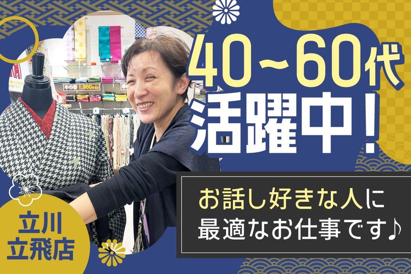 仕事内容 ✨⭐………………………………………… < 日本文化を伝えるお仕事 > きものの色柄や季節感を楽しみ、 お客様に合った一枚をご案内します。 パートでも安定収入を得られる職場♪ …………………………………………⭐✨ 「着物は難しそう…」 と思っていませんか? 当社では異業界からの転職者が活躍中! 営業・事務・サービス・販売など、 前職はさまざまですがゼロから挑戦OK。 研修とOJTで基礎からしっかり学べます。 フルタイム勤務で安定して働ける環境。 「異業種から安定収入を得たい」方にも 安心して始めていただけます。 ┏━━━━━━━━━━━━━━━━┓ ★ 具 体 的 な お 仕 事 ★ ┗━━━━━━━━━━━━━━━━┛ ・きものや和雑貨の接客販売 ・ご挨拶や用途のヒアリング ・商品提案やご試着サポート ・お会計・ラッピング対応 ・商品整理や店内清掃 入社後は基礎研修からスタート。 すぐに販売を任されることはなく、 未経験でも安心して学べます。 ┏━━━━━━━━━━━━━━━━┓ ★ ス タ ッ フ の 声 ★ ┗━━━━━━━━━━━━━━━━┛ ・営業職から接客に挑戦(40代) ・保険業界から販売職へ(50代) ・事務職から人と関わる仕事に(30代) ・美容スタッフから和の世界へ(30代) ┏━━━━━━━━━━━━━━━━┓ ★ こ ん な 方 に 最 適 ★ ┗━━━━━━━━━━━━━━━━┛ ✔ 異業種から安定収入を得たい方 ✔ パートでもフルタイムで働きたい方 ✔ 人と話すことや接客が好きな方 ✔ 未経験・ブランクありでも挑戦したい 年齢や前職は一切問いません。 あなたの“人と関わる力”が強みになります 新しい一歩をここから始めませんか? ✨