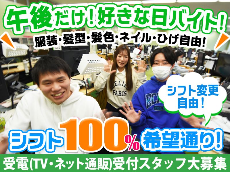 仕事の内容 \あなたらしく働ける自由シフトのオフィスワーク/ ★この求人の魅力ポイント 副業・学生歓迎!大学4年生や就活が終わった先輩も多数活躍中 服装・髪色・ネイル・ピアス自由!自分のスタイルで働けます シフト提出は自己都合優先&当日変更や追加勤務もOK 「遊びの予定が入った」そんな日も勤務日を振替可能な柔軟シフト 社会人になって役立つ話し方・伝え方のスキルが身につく 車・バイク通勤OK&ガソリン代支給あり 先輩大学生から就活のコツも聞ける環境 ★お仕事内容 テレビやラジオの通販番組をご覧になったお客様からの 「注文したい」「詳しく知りたい」というお電話に対応します。 扱う商品は、美容コスメやサプリメントなどのヘルスケア商品が中心。 すでに購入を検討しているお客様がほとんどなので、無理な営業やノルマはありません。 ★未経験でも安心の研修体制 スタッフのほとんどが未経験スタート! マニュアル完備&段階的な研修で、安心してお仕事を始められます。 座学研修:業界や商品知識を学習 ロールプレイ:先輩スタッフと実践練習 OJT研修:現場デビュー後も約100時間のフォローあり 実物の商品を見ながら覚えていけるので、徐々に知識を身につけられます。 ★働くイメージ お客様からご注文の電話が入ります ↓ 「ご注文希望の商品をお教えください」 ↓ 「こちらでお間違いないでしょうか?」とマニュアルに沿って確認 難しい対応はなく、落ち着いて会話ができればOKです。 面接や質問はお気軽に! 新しいチャレンジを、私たちが全力でサポートします。