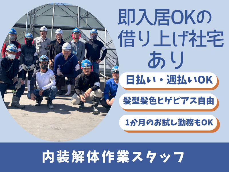 仕事内容 ✨新着求人✨ ====当社のアピールポイント==== ✅即入居OKの借り上げ社宅を完備しています! ⇒単身者用、カップル用、ファミリー用 など敷金・礼金など不要で入居可能! しかも… 家具家電付き&光熱費は当社負担! 都内に格安で住めます♪ ✅勤続1年後20万円支給します!(規定有) ✅現場仕事が初めての方も大歓迎です! ⇒学歴・経験・資格など一切不問! 大切なのは、「意欲」や「やる気」です! ✅日払い・週払いもOK♪(規定有) ✅髪型・髪色・ピアス・ヒゲ自由♪ ⭐お仕事内容について⭐ あらゆる建物を対象とした 内装解体工事をお任せします。 内装解体の工事は、 特にテナントなどの賃貸物件で 多く行ないます。 退去時、元の状態へ戻すことを 目的に、内装部分のみを解体します。 ⭐新生活応援!借り上げ社宅あり⭐ 未経験の方や無資格の方も応援!! 引越時の敷金・礼金は会社負担 入居後の光熱費も会社が負担します! 社員寮ではなく、賃貸物件の1部屋なので 同じマンションに先輩がいて、、、 なんて事もありません! プライベートもしっかり確保できます! ✨株式会社ケイ・エス・ケイについて✨ おかげさまで多数のご依頼に恵まれ、 業績も好調を維持しております。 そこで、今後さらに事業を拡大すべく、 スタッフの求人を行なっています。 入社後はそれぞれの現場に携わって 頂きます。 飲み会やBBQ、忘年会といった 社内行事を通して、普段から親睦を 深めています。新しい仲間として 弊社に加わって下さる事を、 スタッフ一同心より楽しみにしています!