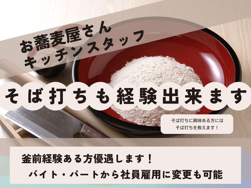 仕事内容 私たちのお店は、昭和の懐かしさを感じる和風の店内で、手打ちそばを提供しています。 そばレストランとして、女性のお客様にも多く親しまれており、落ち着いた雰囲気とおもてなしの心で、多くの方々に愛され続けています。 地元のサラリーマンや家族連れ、特に女性客にも人気のある温かい雰囲気のお店です。 ★ 未経験OK!家庭と両立しながら働ける! ★ 主婦(夫)歓迎!シフトは柔軟に対応◎ ★ 平日のみの勤務も可能♪ 仕事内容 キッチンスタッフとして、調理業務を中心にお任せします。 ~具体的には~ 手打ちそばの準備 料理の盛り付け 食材の仕込み キッチンの片付け など *まずは簡単な業務からスタート! 未経験の方でも安心して始められます。 家庭との両立がしやすい柔軟なシフトも魅力です。 <<希望する方には、そばの実を石臼で自家製粉した蕎麦粉を使用したそば打ちを覚える事も可能です>>