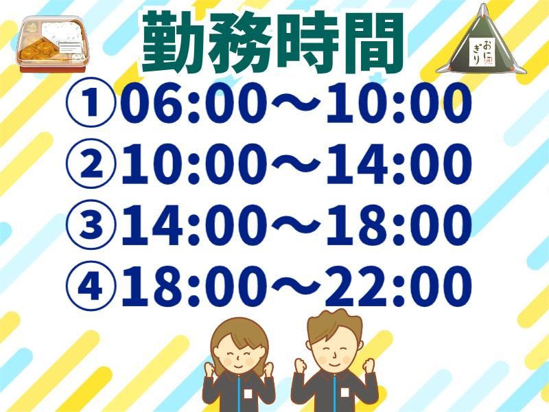 シフト制 勤務時間詳細 <お好きな時間帯から選べます> ①6:00~10:00 ⇒早朝手当あり 6~8時は【時給30円UP!】 ②10:00~14:00 ③14:00~18:00 ④18:00~22:00 *実働4時間 *土日祝を含む週2日~相談OK! ★勤務曜日、日数については遠慮なくご相談ください ★テスト期間、お子さんの学校行事など ご都合でのシフト調整も相談可能♪ ★扶養内OK!