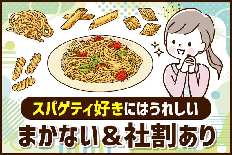 職場環境 カフェメニューもあるお洒落なお店♪ アットホームな雰囲気で困ったこと などがあればすぐ相談できる環境です! 美味しいまかないも嬉しいポイント☆ メニューから好きなパスタを選べます! 定着率もバツグン◎ 「何度か食べに来たことがあって」という方も活躍中♪