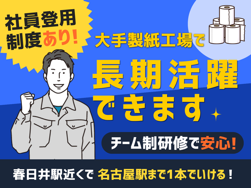 仕事内容 【大手製紙会社で長期勤務できるチャンス✨】 ✅高時給1550円! ✅社員が丁寧にサポート!未経験でも安心です◎ ✅資格・経験不要! ✅家具家電Wi-Fi付、職場・駅チカ寮完備!即入寮OK ✅稼働分前払い制度(規定内) ✅社員登用制度あり◎ ―――――――――――――――――― ✨大手ならではの安心感と好待遇◎ ―――――――――――――――――― ▼大手製紙工場でのトイレットロール製造 ライン補助作業 ✨お電話でのご応募・お問合せも歓迎です! ✨【TEL】0568-27-5514(平日9〜17時) <具体的な業務内容> ✅<チーム制で安心> 1チーム3名(研修中は4名)で、 2つの製造ラインを担当していただきます 重い荷物を運ぶような激しい力仕事ではなく、 機械がスムーズに動くようサポートする 「管理・軽作業」が中心です ✅マシンの清掃・メンテナンス 機械についた紙粉を軽く掃除したり、 外装フィルムを新しいものへ交換したりします ✅品質チェック・整理 2時間ごとに製品の仕上がりをチェック 梱包用の紐などの端材(ゴミ)を片付けるなど、 現場をきれいに保ちます ✅トラブル対応・調整 製品がラインに詰まった際の取り除きや、 機械の簡単な微調整を行います ⭐いきなり難しいことはお任せしません まずは清掃や片付けからスタートし、 仕事に慣れてきた半年後を目安に、 簡単なラインのボタン操作も 少しずつ覚えていっていただきます ================== ✨嬉しいメリット多数✨ ================== ✅面接交通費5000円まで支給♪ ✅3日働いたら1日休みで負担少なめ◎ 交替制に慣れるまでは少し大変かも しれませんが、3日ごとに1日お休みなので 疲れをためずにリフレッシュできます◎ シフト制ですが希望日にお休みを取れますので、 家族や友人との予定にも合わせられますよ♪ ✅長期連休年2回でプライベート充実♪ ✅家具家電付寮完備! 遠方からの転職・単身赴任も安心♪ ・7階建て内装キレイなマンションです (駐車場付き物件もあり) ・自転車5分で職場、徒歩5分でJR春日井駅へ♪ ・名古屋駅まで電車で約25分! ・トイレ/お風呂別で快適◎ ・テレビ・冷蔵庫・洗濯機・レンジ コンロ・カーテン・照明・新品寝具完備! すぐに新生活スタートできます! ==================== ✨ 目指せ正社員!キャリア支援に自信あり ✨ ✨社員登用制度もあり✨ ==================== 「ゆくゆくは腰を据えて働きたい」という方、大歓迎! 現在、正社員への登用を積極的に推進しています♪ 派遣期間中に仕事のコツを掴み、 満了後には社員として活躍する道も! 収入面でも将来設計でも、ワンランク上のステージを目指せる環境です! わからないことや気になる事は なんでも聞いてください◎ ▼お問合せだけでも大歓迎! 【TEL】0568-27-5514(平日9〜17時)