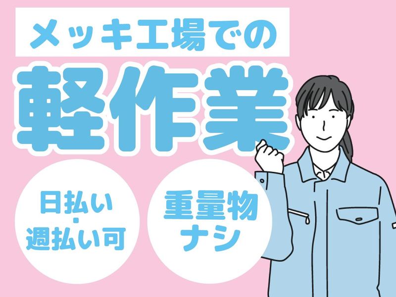 仕事内容 メッキ工場でのお仕事です。 メッキ又は塗装された商品に傷や凹み等がないかを目視検査します。 検査後の商品を包装したり、箱詰めしたりの軽作業です。 ☆彡立ち仕事もあれば座り仕事もあります。 扱う商品は基本的に手のひらに収まるようなサイズのもの なので力仕事はなし! もくもくと作業に集中できます。