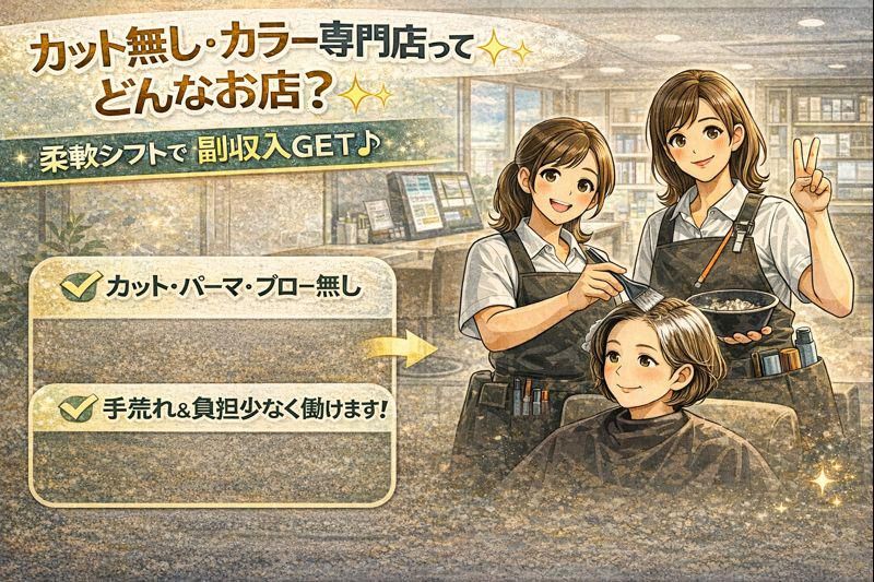 仕事内容 ⭐-⭐-⭐-⭐-⭐ 美容師免許があれば実務未経験OK! ライフスタイルに合わせて働けます♪ 月2回勤務のスタッフも在籍中✨ ⭐-⭐-⭐-⭐-⭐ \この求人のポイント/ ✨ 週1日~/週0日の週があってもOK! ✨ カット業務なし!カラー専門店♪ ✨ 8:30~勤務できる方を積極採用中 ✨ ネイルOK★ブランクOK! ✨ 副業として働くスタッフが多数活躍中 お任せするのは、白髪染め・リタッチなどカラー施術のみ! ✅ カット・パーマ・縮毛矯正なし ✅ ブローはお客様自身で行います ✅ 券売機対応でレジ業務なし♪ ✅ カラー剤はPC表示で調合ラクラク! ✅ オートシャンプー導入で手荒れ軽減 などなど、働きやすい条件が揃っています★ 「美容の仕事には戻りたいけど、フル施術は正直しんどい…」 そんな方にピッタリの環境です✨ 自分のライフスタイルに合わせて、休みの日やスキマ時間に働けるので無理なく続けられます♪ 週0日の週があってもOK!実際に月2回勤務のスタッフも在籍中です! 免許は持ってるけどブランクがあって不安…なんて方もお気軽にご応募ください◎