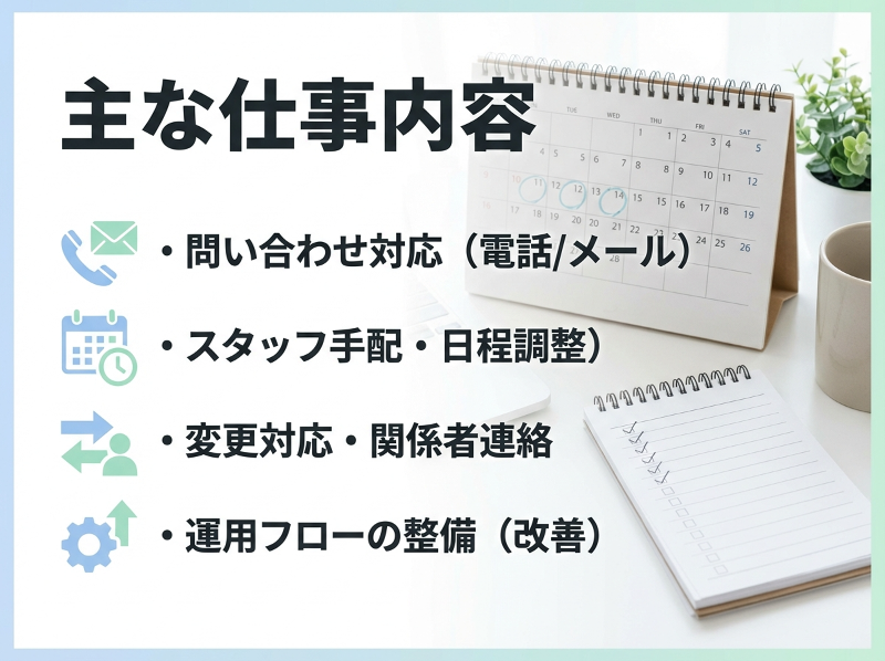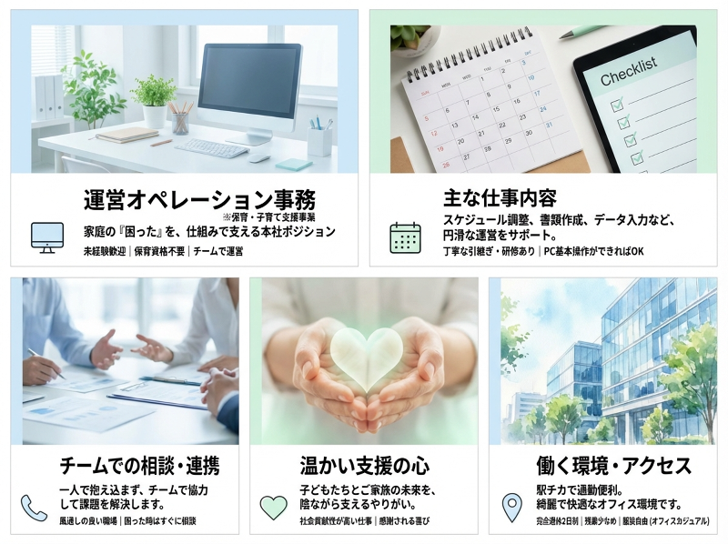 仕事内容: ライフサポート事業部(本社)にて、保育・子育て支援サービスの運営を支える事務・調整業務です。 単なる事務作業ではなく、会話や気配りを活かし、調整・判断・改善が発生する“運営職”です。 主な業務 * ご利用者様からの問い合わせ対応(電話・メール等) * サービス提供スタッフ(保育士・ナニー等)の手配・スケジュール調整 * スタッフへの研修実施 * 変更・キャンセル等の対応(関係者への連絡/代替案の提案) * 稼働状況の確認・簡単なフォロー(連絡・共有) * 必要書類や案内の作成・管理 * よくある問い合わせの整理、対応フローの整備(仕組み化・改善) 1日の流れ(例) 午前:依頼状況の確認/手配調整・連絡/打合せ 午後:問い合わせ対応/資料作成/社内連携/会議・打合せ 夕方:翌日以降の調整・共有/改善タスク整理