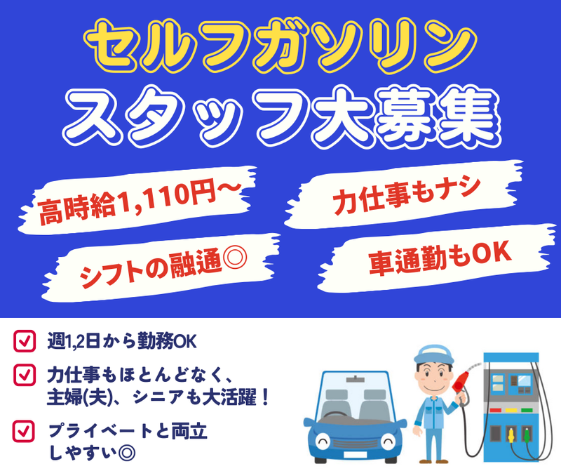 仕事内容 ─┘─┘─┘─┘─┘─┘─┘─┘─┘ ▼働きやすい理由&魅力▼ ✅窓拭きやオイル交換業務なし! ✅給油監視メインで体力の負担少なめ! ✅週1,2日〜OKで自分のペースで働ける! ✅ノルマなしで自分のペースで働ける! ✅オープンして1年の綺麗な職場! ─┘─┘─┘─┘─┘─┘─┘─┘─┘ 【業務内容】 セルフガソリンスタンドの見守り業務をお任せします。 給油などの力仕事や接客、販売ノルマは一切ありません。 お客様が安全に給油できるようモニターで確認し、許可ボタンを押すシンプルな業務が中心です。 ▼ 具体的なお仕事 ▼ ・給油操作でお困りのお客様へのサポート ・店内の簡単な清掃やゴミ捨て ・備品の整理整頓などの管理業務 ・安全確認と給油許可ボタンの操作 ✨経験ゼロでもこれで安心✨ 1.難しい整備や販売ノルマは一切ないので、未経験からでも始めやすい環境です。 2.マニュアル完備で、最初は先輩スタッフが丁寧に教えるので安心です。 3.室内での座り仕事が中心のため、体力に自信がない方でも無理なく続けられます。 <<他にはない、ここで働く魅力✨>> 1.60代・70代のシニア世代が現役で活躍している職場環境です。 2.セルフ式のため窓拭きがなく、天候に左右されず快適に勤務できます。 3.週1,2日から勤務可能で、効率よく稼げます。 4.対面接客が少なく、自分の時間を大切にしながら落ち着いて働けます。 ※危険物取扱者乙種4類必須