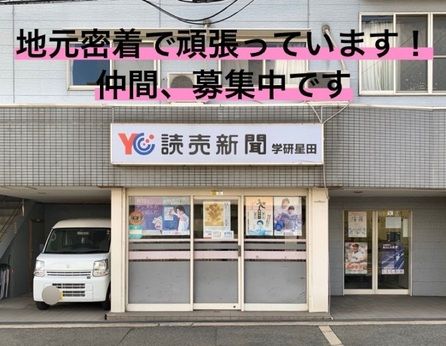 選考プロセス 〈1.応募〉Webまたはお電話から応募。 〈2.面接〉履歴書(写真貼付)をお持ちください。 仕事内容や職場についてなど、気になることや ご希望はなんでもお聞かせくださいね。 〈3.採用〉あなたに会えることを楽しみにしています! 勤務開始日もお気軽にご相談ください。 ※応募の秘密は厳守します。 【問合せ先について】 問合せ先:072-891-5162 地域に根ざして活躍する読売新聞販売店 (YC=読売センター)でじっくりお仕事しませんか? 丁寧なサポート&ライフスタイルに合った働き方で、 安心してスタートできます! 応募方法 Webまたはお電話でご応募ください。 Webの場合は、応募シートを入力の上、送信ください。 面接日など追ってご連絡します。 お電話の場合は、連絡後に履歴書(写真貼付)を持参ください。
