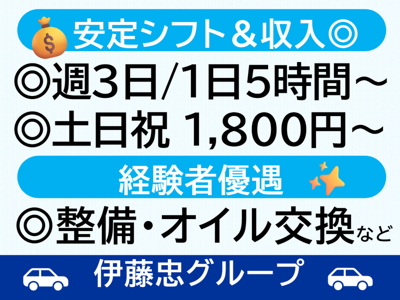 仕事内容 ☆★この求人のPOINT★☆ 伊藤忠グループ/24年5月設立 ・”土日祝”勤務は、時給300円アップ! ・資格不要! ・自動車の知識不要! ・整備士資格取得支援あり! ・正社員登用実績あり! ・整備経験者も歓迎! ・長期勤務できる方歓迎! 【仕事内容】 私たちは、中古車販売/買取店 『WECARS』を全国に約250店舗 展開しており、スタッフ一人ひとりが、 お客様のカーライフに寄り添った 最高のサービスを提供しています。 今回募集するのは、お客様のクルマを安全に 保つためのオイル交換専門スタッフです。 ■メイン業務:オイル交換作業 ご来店されたお客様の車両のオイル交換を 担当していただきます。 ・お客様の受付対応 ・作業前のご案内、立会い説明 ・オイル・オイルフィルターの交換 ・作業内容のご報告(口頭+データ入力) 整備のスキル・習熟度に応じて、 その他軽整備や整備補助作業にも チャレンジ可能です! ■そのほかの業務 ・簡単なデータ入力(作業記録など) ・お客様への丁寧な説明・ご案内 ・作業スペースの清掃、工具の整理整頓など 【無資格から整備の道へ!】 このバイトからスタートして、 整備士資格を取得し、 正社員になった先輩も複数名います! 「整備の資格はないけど、 クルマに関わる仕事がしたい」 「整備士を目指しているけど、 まず現場で経験を積みたい」 プロの技術を身につけていきたい方にも ピッタリの環境です。 【安心のサポート体制】 整備の知識がなくてもOK! 業務はマニュアル完備・OJTありで しっかりサポート。 作業は基本的にチームで進めるので、 わからないこともすぐ聞けます。 入社後は、整備士の先輩の近くで 学びながら成長できます。 ★若手スタッフ(20代中心)が 多数活躍中! 同世代の仲間と一緒に、 クルマに関われる仕事を始めてみませんか? ★整備経験がある方や、 車の知識がある中高年の方も歓迎! スキルや経験を活かして働きたい方にも ピッタリの環境です。 【注意事項:通勤車両について】 当店は整備工場を併設しております。 工場の認可を守るため、 マイカー通勤の方は「車検適合車」での 通勤をお願いしております。
