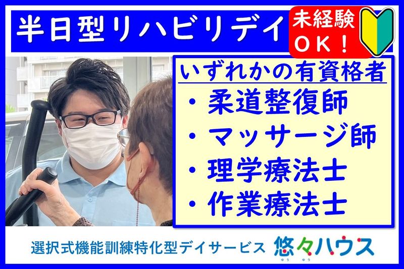 【応募資格】 ■デイサービス未経験・介護業界未経験も歓迎です。 ■普通自動車免許(AT限定OK) ■下記いずれかの有資格者 ・柔道整復師 ・あん摩マッサージ指圧師 ・鍼灸師(デイサービスやデイケアの勤務経験3年以上) ・理学療法士 ・作業療法士 ・正看護師 ・准看護師 ◎経験、ブランク不問 機能訓練・介護施設での経験がない、現場からしばらく離れていた方も大歓迎です。 「介護予防のリハビリに興味がある」「コミュニケーションを大切にしている」といった方大歓迎です。 【メリット】 #新卒歓迎 #第二新卒歓迎 #未経験者歓迎 #経験者歓迎 #ブランクOK #学歴不問 #交通費支給 #社会保険完備 #40代も応募可 #車通勤OK #バイク通勤OK #制服貸与 #昇給あり #賞与あり #残業月平均20時間以内