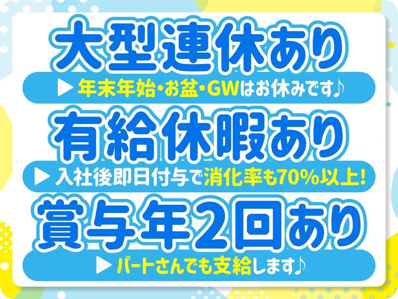 休日休暇 土曜、日曜、他、長期休暇有 *勤務シフトの決まり方 前月の中ごろに、翌月のシフトの調整を行います。 お休みの希望がある場合は申し出ていただき、 ほぼご希望通りになるように調整しております。 有給休暇(消化率70%以上) 育児休業(取得実績あり) 夏期休暇(10日程度) 年末年始(10日程度) GW 慶弔休暇・子の看護休暇・介護休暇など *夏期と年末年始に8~10日程度の大型連休があるので、 お子さんの夏休みや冬休みのときにも、 家族の時間を大事にしていただけます。