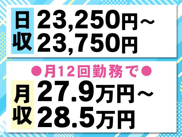 時給2,000円以上 給与 時給2,000円 ※試用期間3カ月間無遅刻無欠勤で、 業務が一人で遂行できれば時給2,000円適応 日収23,250円~23,750円 内訳:時給2,000円(深夜帯は時給2,500円/深夜手当含)×実働10.75h~11h 月収279,000円~285,000円 内訳:週3日、月12日勤務