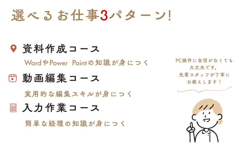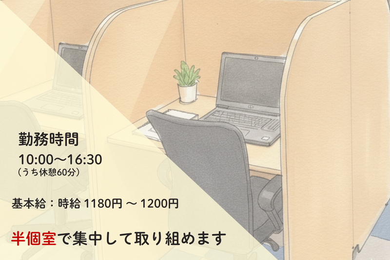 仕事内容 ✦・・・・──・・・・✦・・・・──・・・・✦ ・昨年OPEN♪綺麗なオフィス ・未経験スタート90%以上♪ ・シフト相談OK♪無理なく ・丁寧なレクチャーで安心◎ ・PC1人1台で作業快適 ・仕切りあり♪業務に集中OK ・電話・接客なしで安心! ✦・・・・──・・・・✦・・・・──・・・・✦ 「PCを使った仕事がしたいな」 「事務職にチャレンジしたいけど、 経験がないから一歩踏み出せない…」 そんな風に考えているあなたへ。 私たちと一緒に、新しい一歩を 踏み出しませんか? 昨年オープンしたばかりの、 ピカピカで快適なオフィスがあなたの職場。 今回は、新しい仲間を大募集します! <あなたにお任せしたいお仕事> スキルや「やってみたい!」に合わせて、 色々なPC事務ワークをお任せします。 ◆データ入力などの事務サポート 領収書の金額を入力したり、 ネットで情報を集めてリストを作ったり。 コツコツ作業が得意な方にピッタリ! ◆資料作成やデザインのサポート WordやPowerPointで見やすい資料を作成したり、 動画編集のお手伝いをしたり。 デザインに興味がある方、大歓迎です! ◆その他、PCを使った事務作業 Excelでのデータまとめなど、 一般的なオフィスワークもお願いします。 \ ★ 自分に合う仕事が見つかる ★ / 「データ入力から始めたけど、 デザインの仕事も面白そう!」 そんな時は、お仕事内容(コース)の 変更も相談OKです! あなたの「やってみたい」気持ちや 得意なことに合わせて、 無理なくスキルアップできますよ◎ <PCスキルに自信がなくても大丈夫?> はい、心配いりません! 「実はPC操作、ちょっと苦手で…」 「ブランクがあって不安…」 そんなあなたも大歓迎です! 分かりやすい動画研修をご用意しているので、 自分のペースでしっかり学べます。 気になる部分は何度でも見返せますし、 ExcelやWordの基本操作も、 先輩スタッフが隣で丁寧にお教えします。 いきなり難しいことをお任せしたり、 一人で悩ませたり…なんてことは絶対にないので、 安心してくださいね。 <働きやすさも、自慢です!> 長く安心して続けてほしいから、 働きやすい環境もしっかり整えています。 ☆1フレックス制で柔軟に働ける! 10:00~18:00の間で最大5.5時間勤務可能 (基本は10:00~16:30) ☆土日祝も開所しているので、 安定した収入が見込めます。 ☆有給休暇も取りやすい雰囲気♪ (半休制度もありますよ) ☆服装・髪型・ネイルは自由! オシャレも楽しみながら働けます。 ☆駅チカ!「南森町駅」から徒歩7分! ☆ホッと一息♪ウォーターサーバー完備。 <あなたの「これから」も応援します!> 「将来的には一般企業で働きたい」 そんな想いもしっかりサポート! 提携している人材紹介会社と一緒に、 履歴書の書き方から面接の練習まで、 あなたのキャリアプラン実現を 全力でバックアップします。 ここでなら、きっとあなたらしく輝けるはず。 少しでも「気になる」と思っていただけたら、 ぜひお気軽にご応募ください! あなたにお会いできるのを楽しみにしています。