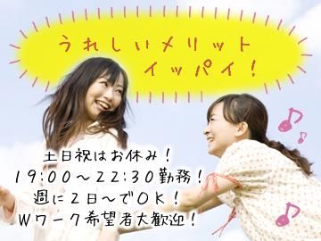 仕事内容 -求人のポイント- ✓土日祝休み!週2日~OK ✓19:00~22:30内でWワークにも◎ ✓3パターンからシフトが選べます♪ ✓未経験OK!数字・文字入力ができればOK - 伝票のデータ入力と チェック作業のお仕事です。 数字や文字を打ち込むだけなので PCの基本操作が出来ればOK! 接客・電話応対などは一切ありません。 同世代の子がたくさんだから 働きやすさも十分◎ 未経験からの挑戦も大歓迎です!