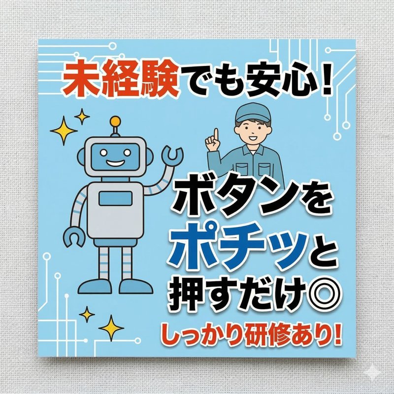 求めている人材 【採用は人物重視♪】 ■無資格・未経験OK ■経験・資格は一切不問 ■学歴不問 ■機械操作や製造経験、 工場経験のない方もOKです♪ ■工場勤務に興味・関心を お持ちの方 ■製造・加工・工場勤務・ 軽作業などの勤務経験を お持ちの方歓迎 ■ブランクがある方も歓迎! ■高時給でしっかり稼ぎたい方