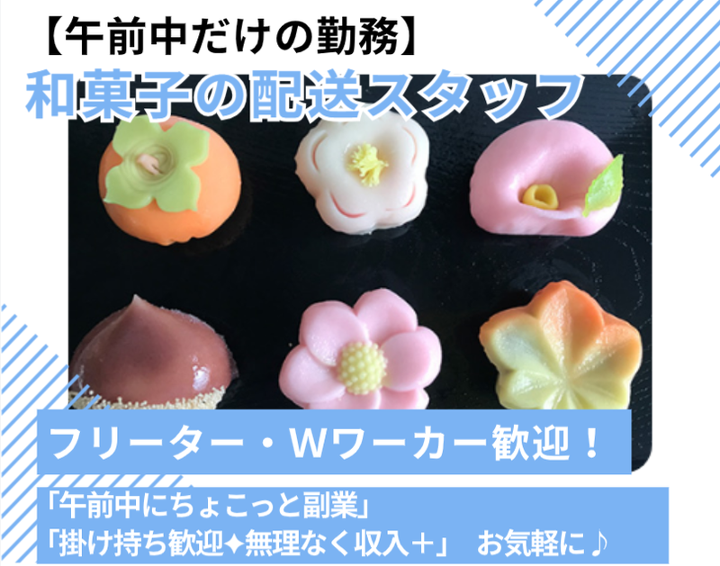 仕事内容 副業・Wワークにちょうどいい! 本業前の“午前4時間”でムリなく副収入⭐ 普通免許(AT限定OK)で始められる、 和菓子のルート配送&陳列サポート業務! 静岡市内のスーパーをまわって、 和菓子をお届け&売場の補充をお願いします。 運転するのは小回りの利く 軽ワンボックスのAT車! また、簡単な伝票の作成業務もありますが iPadに入力 → PCで印刷するだけの シンプル操作。 事務経験がなくても大丈夫です! ✅入社後は先輩スタッフと一緒に 業務を進めながら、段階的に仕事を 覚えていただきます。 4~5日ほどで基本的な業務は習得可能 ですので、未経験の方でも無理なく スタートできます。 ・・・・・・・・・・・・・・・・・・・・・・・・・・・・・・・・・・・・・・ ▶ 1日の流れ(例) 07:00 出勤・商品の積み込み 07:20 市内スーパーへ配送・陳列補助 (5~10件) 11:00 帰社・簡単な伝票出力→退勤♪ ※「もうちょっと稼ぎたいな…」 という方は、13~14:00まで 製造のお手伝いをして頂く事も可能! ・・・・・・・・・・・・・・・・・・・・・・・・・・・・・・・・・・・・・・ ▶ こんな方におすすめ! ☑ 本業前の時間で副収入を得たい ☑ 運転が好き ☑ 接客より、モクモク動く仕事がいい ☑ 難しい作業なしの軽作業がいい ☑ デスクワークにも少し慣れたい✍ ・・・・・・・・・・・・・・・・・・・・・・・・・・・・・・・・・・・・・・ ▶ ここがポイント! ✔ 午前中のみで予定が立てやすい ✔ 静岡市内のみ!長距離運転ナシ ✔ 軽自動車で安心スタート ✔ 扶養外・掛け持ち勤務OK ✔ カンタンな伝票入力あり ・・・・・・・・・・・・・・・・・・・・・・・・・・・・・・・・・・・・・・ HPに商品や職場の様子をUPしています! ぜひ「菊月本店」で検索してみてください! 「具体的な仕事内容を知りたい」 「私でも働けるの?」など、質問だけでも 大歓迎です! 「応募しようか迷っている…」 そんな方もぜひ気軽にお電話くださいね⭐ ・・・・・・・・・・・・・・・・・・・・・・・・・・・・・・・・・・・・・・ 電話での応募も大歓迎です! 054-345-3090 上記までご連絡下さい! 質問だけでも大丈夫です!