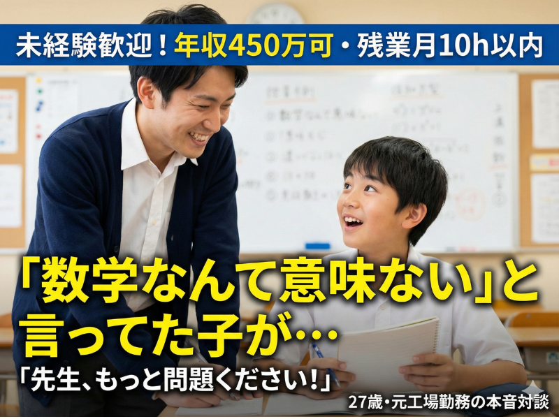 年俸2,867,382円~8,560,683円 給与詳細 基本給:年俸 286万7382円 〜 856万683円 固定残業代:なし 【一律手当】 全員に一律で支払われる通勤・皆勤・家族手当金額:なし 全員に一律で支払われるその他手当金額:なし 給与 280万円~800万円 経験・能力を考慮の上優遇します。 <賃金内訳> 月給(基本給) 200,000円~280,000円 昇給有 残業手当有 教室長段階:年収280-350万円 教務主任段階:年収350-450万円 ■昇給:年1回 ■賞与:年2回 (計2ヵ月分程度 6月・12月に支給) 給与モデル(支給実績) 27歳 460万(入社3年) 25歳 420万(入社2年) 38歳 300万(入社1年) 記載金額は選考を通じて 上下する可能性があります。 月給は固定手当を含みます。 【給与例】 給与例 27歳で「人生を無駄にしている」と 感じているあなたへ もしかして、 こんな毎日を送っていませんか? 毎朝6時30分に目覚まし。 また同じ一日が始まる。 豊田市内の自動車部品工場へ 向かう車の中で、ふと思う。 「俺、何やってるんだろう...」 生産管理部門で5年。 毎日同じデータ、同じ報告書、 同じ会議。年収380万円。 悪くない。でも心の奥底で 叫んでいる声がある。 「このまま30歳、35歳になって、 振り返った時に何が残るんだ?」 大学時代、半年間だけ 個別指導塾でアルバイト。 中学2年生が数学を解けるように なった瞬間の輝いた目。 あの達成感が忘れられない。 でも現実は厳しい。 父親は「製造業は安定している」、 母親は「給料下がったら?」と 心配する。同期は次々転職していく。 自分だけが取り残されている。 実は、私も全く同じでした 株式会社夢尊代表の福岡です。 7年前、大手銀行の融資部門にいました。 年収600万円。 「エリートコース」と言われていました。 でも毎日が苦痛でした。 新融資スキームを3週間で提案→ 「前例がない」で却下。 企画書→ 「新卒が何言ってるんだ」で無視。 このまま続けても成長しない。 人生を無駄にしている。 そう確信しました。 最悪だったのは、何もしなければ 5年後、10年後も同じ繰り返し。 気づけば転職市場で 「手遅れ」と言われる年齢。 結婚相手からも「将来性のない男」 として避けられる未来が見えていました。 でも今は違います。 毎朝目覚めるのが楽しみ。 生徒の成長に心が躍る。 年収は銀行員時代を上回り、 何より「生きている実感」があります。 どうして人生が180度変わったのか? 「教育業界への転職」という 解決策に出会えたからです。 重要なのは 「段階的成長システム」でした。 第1段階:教室長(1-2年) 生徒25-35名を担当。保護者面談、 進路指導、講師管理、売上責任まで。 「経営の基礎」を身につけます。 第2段階:教務主任(3年目以降) 全校舎のカリキュラム開発、 講師研修を担当。 「組織運営スキル」を習得します。 第3段階:エリアマネージャー(5-10年後) 複数校舎統括、最終的に取締役候補。 年収450-500万円到達。 このシステムの素晴らしさは 「段階を踏んで確実に成長できる」こと。 いきなり管理職ではなく、 現場で実力をつけるから失敗しません。 私だけではありません 栗田部門長 (入社6年目、32歳、元銀行員): 「銀行時代は提案を 頭ごなしに否定されていました。 今は中学1年から6年間見た生徒が 全員合格した時、嬉し泣きしました。 仕事で涙を流すなんて、 銀行員時代では考えられませんでした」 収入:30万円/月→35万円/月 休日:残業地獄→完全週休2日制 やりがい:数字達成のみ→生徒の成長実感 佐藤教室長 (入社3年目、29歳、元製造業): 「工場勤務5年間、毎日同じ作業。 今は生徒一人ひとりが違うから 毎日新鮮です。 『先生のおかげで合格できました』 と言われた時、この仕事を選んで 本当に良かったと思いました」 あなたの人生を変えるチャンス 株式会社夢尊の教務主任候補として、 特別に「未経験歓迎」で募集します。 なぜ?2030年までに12校舎展開の 明確な成長計画があり、 あなたのようなポテンシャル人材が 必要だからです。 提供するもの: ・1-2ヶ月徹底研修 (社長・部門長が直接指導) ・希望地域での新教室立ち上げ ・年収280万円→5年後450-500万円の 明確キャリアパス ・完全週休2日制、年間休日125日 ・残業月10時間以内 条件: 「教育への強い情熱」 「人の成長を喜べる人」 「挑戦を恐れない人」 この3つを満たす人だけです。 人生を変える決断の時 今すぐ応募フォームに記入してください。 15分のWeb面談から開始。 在職中でも調整可能。 ただし期限があります。 教務主任候補は「1名のみ」募集。 明日、同じように人生を変えたい人が 応募するかもしれません。 3年後、あなたはどちらにいますか? 同じ工場で同じ作業を 続けているあなた? それとも30名の生徒の成長を見守り、 「先生、ありがとう」と言われる 教務主任として充実した毎日を 送るあなた? 選択権はあなたにあります。 でも今日を逃したら、 二度とこのチャンスは訪れません。 今すぐ応募してください。 あなたの新しい人生が、 今日から始まります。 株式会社夢尊 代表取締役 福岡 「一度きりの人生を、 適当に過ごす