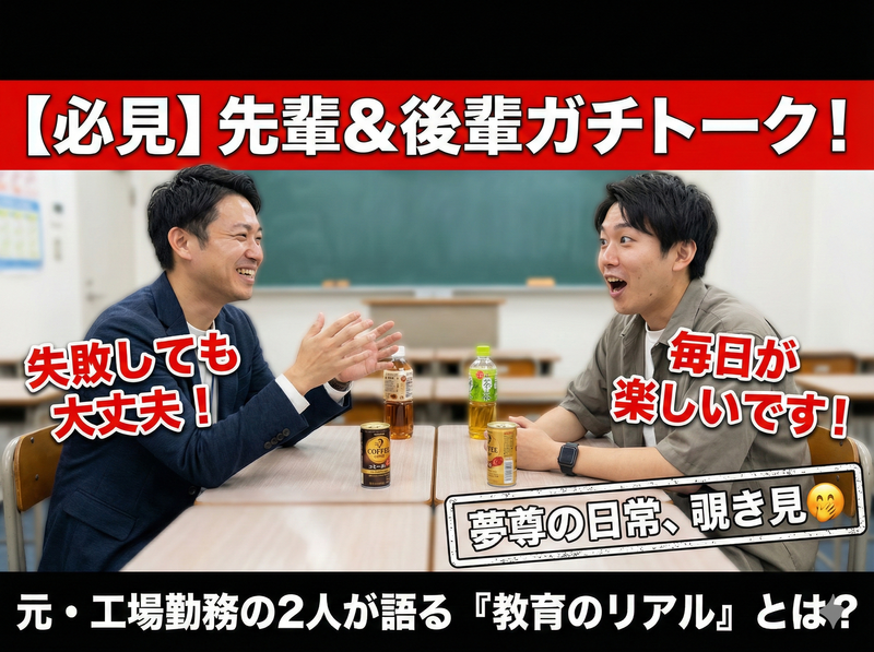 仕事内容 株式会社夢尊 「現教務主任×新人講師 本音対談」 司会:本日は株式会社夢尊で 活躍されている佐藤教務主任と、 入社2年目の田中講師に リアルなお話を伺います。 まずはお疲れ様でした。 佐藤主任:お疲れ様です。 田中さん、今日は堤校の授業 どうでした? 田中講師:お疲れ様です。 実は今日、中学2年生の山田くんが 関数の問題をスラスラ解けるようになって。 3ヶ月前は「数学なんて意味ない」 って言ってたのに、今では 「先生、もっと難しい問題ください」って。 この瞬間があるから辞められないんですよね。 佐藤主任:分かります。 私も最初は製造業から転職して 不安だらけでした。 教育経験ゼロで、生徒との距離感に 本当に悩んでました。 でも田中さんも同じような経験 ありましたよね? 田中講師:そうなんです。 前職は豊田市内の自動車部品工場で 生産管理をやってて。 最初は「工場勤務の自分に 教えられるのか」って不安で。 初日なんて緊張しすぎて 生徒の名前覚えられなくて。 佐藤主任:それ、私も同じでした。 でも福岡社長が言ってくれたんです。 「完璧である必要はない、 生徒と一緒に成長すればいい」って。 この言葉で肩の力が抜けました。 田中講師:ああ、その言葉私も言われました。 うちの会社って失敗を責めるんじゃなくて 「次はこうしてみよう」って 一緒に考えてくれるんですよね。 前の会社では「なんでできないの」 って空気だったけど、 ここは「どうしたらできるかな」 って視点なんです。 司会:職場の雰囲気について 具体的に教えてください。 佐藤主任:毎日17時30分から 「振り返りタイム」があるんです。 「今日の授業どうだった?」 「あの説明、もう少し工夫できそう」 って先輩後輩関係なく 率直に意見を言い合える。 この時間が明日をより良くする 原動力になってます。 田中講師:それすごく感じます。 昨日も中学3年生の進路指導で悩んでたら、 佐藤さんだけじゃなくて 他の教室長も「一緒に考えよう」って。 みんなで生徒を見守る文化が 本当にあるんです。 司会:1日の流れはどんな感じですか? 佐藤主任:朝8時15分に出社して コーヒー飲みながら今日の作戦を立てます。 昨日の小テスト結果をチェックして、 つまずいてる生徒がいたら 個別フォローの準備。 14時からは実際の授業が始まって、21時まで。 でも残業は月10時間以内って決まってるので、 22時には必ず帰れます。 田中講師:私の場合、15時から18時は 小中学生、19時から21時は 高校生の指導が多いです。 合間の18時に保護者面談を入れることも ありますが、「お母さん、実は太郎くんは 友達思いなんです」って成績だけじゃない 成長を伝えると、保護者の方の表情が パッと明るくなる。 この瞬間が製造業時代では味わえない 達成感です。 司会:転職への不安はありませんでしたか? 田中講師:正直、 給料下がるんじゃないかって不安でした。 でも1年目は月23万円からスタートして、 今は月28万円。 2年目でこれだけ上がったのは驚きでした。 佐藤主任:私は3年目で月35万円になりました。 教務主任になってからは 全校舎のカリキュラム開発も任されて、 やりがいも収入も両方上がってます。 司会:休日の過ごし方はいかがですか? 田中講師:日曜は完全にオフです。 土曜日は生徒の都合で 出勤することもありますが、 平日に代休取れるので 週休2日は確実に確保されてます。 有給も取りやすくて、 先月は3連休作って温泉旅行に行きました。 佐藤主任:うちの会社、 「先生の働き方が生徒の手本になる」 って代表がよく言ってるんです。 だから無理な残業はさせない、 きちんと休むって文化が根付いてる。 働きやすさと教育への情熱、 両方大切にしてる会社だと思います。 司会:堤校の特徴はありますか? 田中講師:堤校は豊田市堤町にあるので、 地元の中学生が多いんです。 みんな素直で、一度信頼関係ができると 本当に一生懸命勉強してくれる。 保護者の方も教育熱心で、 学校と家庭と塾の三位一体で 生徒を支えてる感じがします。 佐藤主任:地域密着型の良さがありますよね。 生徒の兄弟が通ってくれたり、 卒業生が高校の制服で 挨拶に来てくれたり。 地域に根ざした教育ができてるなって 実感します。 司会:どんな人に来てほしいですか? 佐藤主任:教員免許とか塾経験がなくても 全然大丈夫です。私たちが見てるのは、 生徒の成長を心から喜べるか、 「なぜ?」を大切にできるか、 チームで支え合えるかです。 田中講師:製造業出身の私でも 活躍できてるので、 異業種からの転職でも安心してください。 1ヶ月から2ヶ月の研修で基礎は身につきますし、 分からないことがあれば 必ず相談できる先輩がついてくれます。 佐藤主任:新しく来る人には 「完璧を求めなくていい、 一緒に成長していこう」って伝えたいですね。 生徒の「ありがとう」の一言で、 この仕事を選んで本当に良かったって思える。 そんな仲間を待ってます。 司会:最後に一言お願いします。 田中講師:27歳で転職し