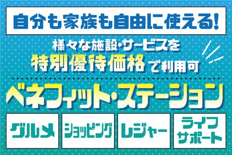 【保険制度】 雇用保険、労災保険、健康保険、厚生年金 待遇・福利厚生 【福利厚生】 ・3ヶ月毎5万円/年4回プチボーナス支給(規定) ・社会保険完備 ・交通費全額支給 ・車、バイク通勤OK(ガソリン代補助) ・有給休暇 ・制服貸与 ・社員食堂あり ・休憩、昼食スペースあり ・冷蔵庫、電子レンジあり ・お弁当持参OK ・男女別化粧室あり ・屋内原則禁煙(喫煙室あり) ・結婚祝金、出産祝金、扶養こども手当、入学祝金、退職金制度などの福利厚生が充実(規定) ・紹介キャンペーン ※ご紹介くださった方1名につき5万円を進呈(規定) 【ベネフィット・ステーションの利用が可能】 ベネフィット・ステーションとは、 様々なシーンでご利用いただける 総合型福利厚生サービスです。 映画鑑賞やホテルディナー、宿泊施設 などの余暇・レジャー関連をはじめ、 日常で使えるフィットネスや 育児・介護支援、ライフサポートなど 約140万件以上の幅広いメニューを お得な価格で利用できます。 <サービス例> ・全国40,000以上の宿泊施設 ・全国30,000店舗以上の飲食店 ・全国約7,700ヶ所のスポーツクラブ など スタッフさんはもちろん、ご家族の方もお好きなだけ利用できます。