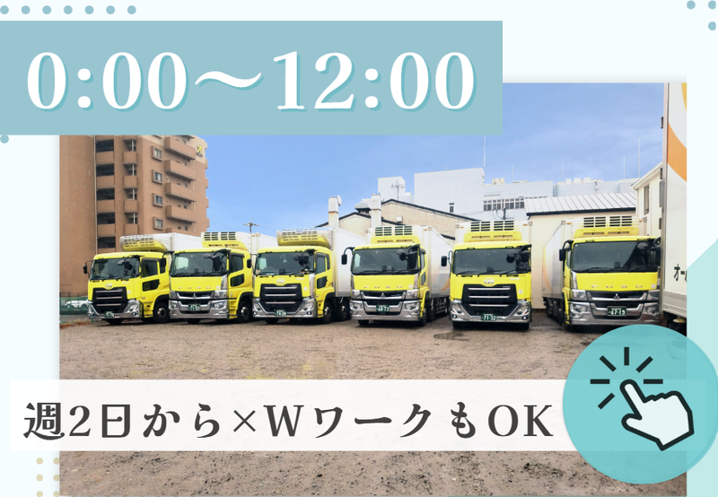 仕事内容 ◆*・*◆*・*◆*・*◆*・*◆ ✅週2日~OK!Wワークも可能! ✅週5日以上のフル勤務も大歓迎! ✅平日のみ・土日のみもOK ✅業務拡大による増員募集 ◆*・*◆*・*◆*・*◆*・*◆ 10tトラックでのルート配送業務✨ 具体的には... 大型スーパーへの食品配送をお願いします! ※1日あたり1~3件の配送となります。 ◆かご積み・かご下ろしは カゴ車のままでの積み下ろしなので、 納品もスムーズです◎ ◆定期配送なので、 ルートが決まっていて安心です♪ ◆1日の配送件数は無理のない範囲と スケジュールが組まれています。 ◆週2日~勤務OK! ご希望に合った働き方ができます! しっかり稼ぎたい方は、 週5・6日の勤務も大歓迎♪ ______________ ◆今期増車予定!増員大募集◆  ̄ ̄V ̄ ̄ ̄ ̄ ̄ ̄ ̄ ̄ ̄ ̄ ̄ 生活に欠かせない食品の配送。 需要が高く安定的に成長中! より多くのご依頼に応えるための増員です! 【 ある社員の一日 】 0:00 自宅から出勤準備、出発 1:00 始業。1便出発、配送先へ。 3:30 ちょっと早めの朝ごはん。 力をつけて頑張ろう! 6:00 2便出発!安全第一! 次の便に向けて仮眠もしっかり。 10:00 3便出発!本日最後の便! 13:00 終業。おつかれさまでした! 14:30 ここからは自由時間 【 先輩スタッフからの一言 】 以前は長距離ドライバーをしていましたが、 宿泊を伴う勤務が体力的に厳しくなり、 家族との時間も大切にしたいと思い 転職を決意しました。 大型免許を活かしたいと考えていたところ、 オールラウンド運輸に出会いました。 現在は10トントラックで 関西・岐阜・名古屋方面への配送を 担当しています。1日1~3件の配送で、 距離にして200~400kmを走ります。 勤務時間は1時~13時です。 夜間・早朝を含むシフトですが、 前職での夜間配送の経験が役立ち、 すぐに業務に慣れることができました! 大幅な残業もなく、決まったリズムで 無理なく働けるのが魅力です。 何より家族との時間が増え、 充実した生活を送れるようになりました。 (40代男性)