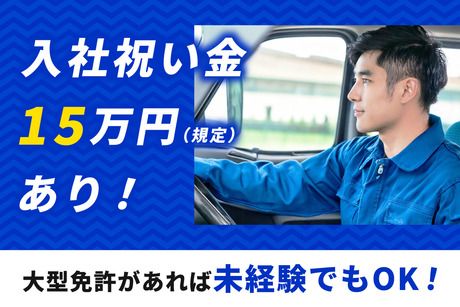 仕事内容 主な仕事は食品の物流センター間輸送。一度ルートを覚えてしまえばカンタンです。 あなたにお任せするのは、 大型トラックによる食品の集荷及び配送業務。 地場配送と長距離幹線輸送(関西~関東)があります。 配送先は決まっているので、道覚えが不安という方でも大丈夫です。 大きな事故を未然に防ぐよう、安全に関する取り組みに力を入れています。 全車両にバックアイカメラ、ドライブレコーダーを装備し、 安全運転をサポートしています。 約束の時間までに目的地にたどり着けるよう、 スケジュール管理が必要になる仕事ですが、 安全第一でお客様の大切な荷物をお届けしましょう。 充実の研修制度で未経験者、ブランクある方も歓迎します! 入社してすぐに仕事をお任せしたりはしません。 だから「大型車を運転するのが不安」「道を覚えられるだろうか」…そんな心配は不要! 先輩が丁寧に指導しますので未経験もブランクがある方も安心してご応募下さい。 せっかく取った大型免許を是非当社で活かして下さい。 嬉しい入社祝15万円! 入社後1ヶ月勤務で5万円、6ヶ月勤務で10万円の合計15万円を入社祝金として支給します。 【 中途入社の方も多数活躍中! 】 「居心地がとにかく良い!ここに転職出来て良かった!」 と話す中途入社の社員も多数◎ 少しでも今より働きやすくしたいと考えている方は、 まずはお気軽にご応募ください!