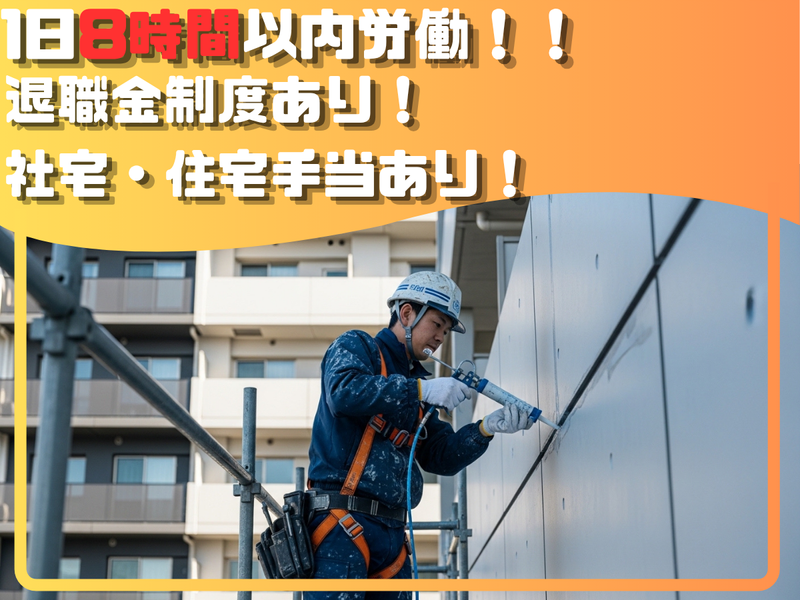 仕事内容 ◎求人のポイント!!! ✅1日8時間以内の就業時間! ✅週休2日制!(日曜、祝日休み) ✅平日休みも相談可能! ✅扶養家族手当あり! ✅役職手当あり! ☆主な仕事内容☆ ✅シーリング作業: 新築の建物にシーリングを打ち込む作業や マンションや戸建ての傷んだ シーリング材を打ち変える作業 ✅防水施工作業: 建物の屋上などで防水材を使って 雨水の侵入を防ぐために行う作業 ・アスファルト防水 ・ウレタン防水 ・シート防水など ≪改修工事について≫ 高経年マンションの質や価値を 長持ちさせていくため <改修工事>を行い、 環境の回復に加え マンションの資産価値を高めます。 ≪防水施工作業について≫ 防水施工作業は、 建物の寿命を延ばすため 外壁内部の防水シートの 破損を早期発見し 早めに対処することが必要となります。 ☆-☆ 1日の流れ 8:25~ 出社 現場集合 8:30~ 朝礼 9:00~ シーリング作業開始 10:00~ 休憩 11:00~ シーリング作業再開 17:00 退勤 ※出社は現場により 現地集合・全員で移動が ございます。 ※休憩時間は 作業進行度により変動 (10時~15時の間で1時間) ☆-☆ 現場の状況によって残業は少な目です!