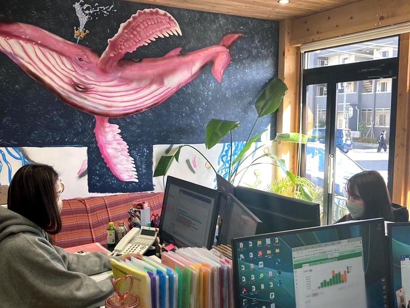 職場環境 ユニークなクジラのイラストが目を引く オフィス内。木のぬくもりを活かした 内装と観葉植物のグリーンが、 ほのぼのムードで落ち着きます。