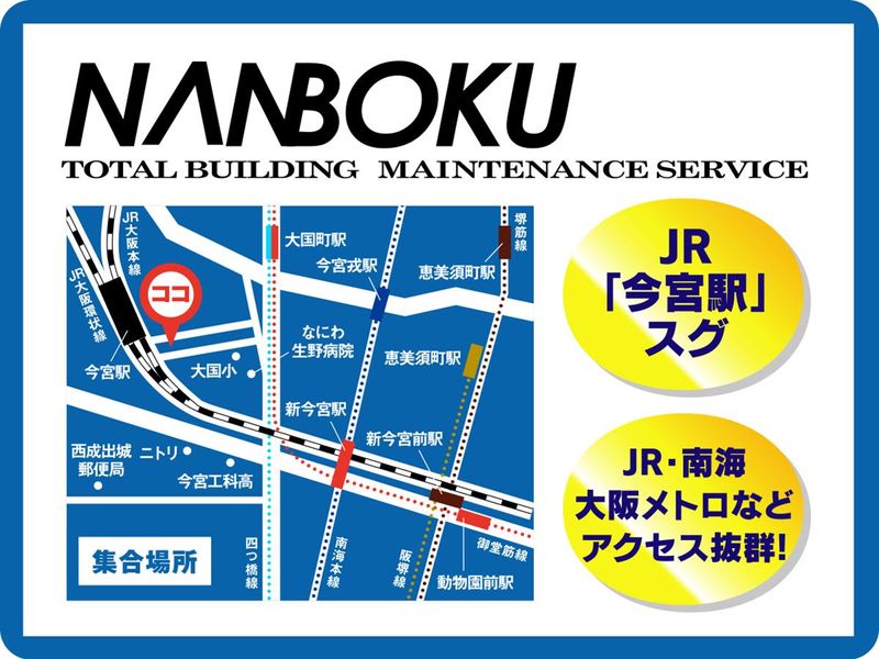 仕事内容 【ココがPOINT!】 ★未経験でも安心の「チーム制」 ★夜勤メインで効率よく稼げる! ★車両運転手当あり(月5000円) ★知識不問/学歴不問/性別不問 ★異業種からの転職も大歓迎! 【身体の負担少なめ&トイレ掃除なし】 清掃の中でも特殊な「トイレ清掃」がないため、 精神的・衛生的なハードルが低く、続けやすいのが特徴です。 【年末年始はしっかりお休み】 ビルメンテナンス業界では珍しく、 年末年始休暇あり!家族や友人との時間も大切にできます。 【年明け1/7〜の勤務開始OK】 「年内はゆっくりして心機一転、年明けから働きたい」 という希望も叶います。 【未経験者の定着率◎】 現在20代〜50代、女性スタッフも多数活躍中。 実際に未経験からスタートした先輩ばかりなので、 新人の「不安な気持ち」を理解してサポートします。 3〜4名のチームで動くから、 未経験や久しぶりの仕事復帰の方でも 安心してスタートできる環境です! 【具体的な仕事内容】 オフィスビルや商業施設などの、床やガラスの清掃をお任せします。 ・専用機材を使った床の洗浄・ワックス掛け ・カーペットのクリーニング ・窓ガラスの拭き掃除 ・片付けなどの軽作業 共用部の床やガラスがメインです。 1日1〜2現場のみ! あちこち移動に追われることはありません。 倉庫からチームで移動! 【1日のスケジュール例(夜勤の場合)】 23:00 出勤・当日の作業内容確認(今宮の倉庫に集合) 23:15 清掃作業スタート(随時休憩あり) 04:30 片付け・報告 05:00 退勤 ※大阪市浪速区の倉庫から直行・直帰になります。 ・JR「今宮駅」徒歩2分 ・大阪メトロ「大国町駅」徒歩7分 *20代~50代の男女活躍中! *女性スタッフも多数活躍中! *適度に身体を動かして健康維持にも◎ 【研修教育】 まずは先輩が1つ1つ丁寧にお教えするので 未経験の方も安心してご応募ください! チーム作業になるので、 常に先輩が近くでサポート致します! 分からないことや不安なことなど、 すぐに質問できる環境です♪