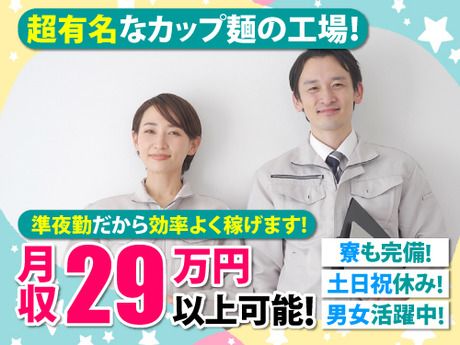 仕事内容 【お仕事内容】 CMでもおなじみのカップ麺工場です! カップ麺を製造する企業でのお仕事です! ▼作業内容▼ カップ麺の製造・検査・検品・梱包作業など軽作業が中心です! 機械が自動的に全ての製造を行いますので、 資材補充などの補助作業を中心におまかせします◎ 取り扱う製品は300g程度と軽量でラクラク~♪ 空調完備で働きやすいです◎ ▼作業はカンタン♪ カップ麺の具材やフタ、容器などを機械に補充する補助業務が中心で、 未経験の方も簡単に覚えることができます☆ 工場勤務が初めての方や、これから工場勤務をスタートしたい方にピッタリのお仕事です! \製造未経験の方も大歓迎です!/ ★作業は簡単なので、未経験の方も大歓迎! ★2週間程度で習熟いただけるお仕事です◎ ★20代・30代・40代・50代の男女活躍中! ★主婦(夫)、子育て中の方、フリーターの方など皆さん歓迎! ★ご面接時に実際のお仕事内容や工場環境などを動画で視聴いただけます! ★ご希望ある方は日勤専属(8:30~17:10)の時間帯も可能です! 【ここがポイント】 ●準夜勤で月収29.1万円以上可能! ●土日祝休み&年末年始・GW・夏季休暇等の長期休暇あり! ●車通勤もOK!無料駐車場完備! ●JR「栗東駅」から徒歩で15分♪ ●友達同士での応募もOK! 【こんな方にオススメ】 ●大手企業で働きたい方 ●製造未経験からチャレンジしたい方 ●久々の仕事復帰の方 ●家計の足しに働きたい方 ●人前に出る仕事が苦手な方 ●モクモク作業が好きな方 ●今より収入上げたい方 ●日中に用事を済ませたい方 ●毎月安定した収入を得たい方 ●地元で働きたい方 ●一人暮らしを始めたい方 ●車通勤できる職場で働きたい方 【完全個室の寮完備!即入寮もOK!】 遠方からお引越しをお考えの方も大歓迎! 寮のご用意があります♪ ▼寮の一例 JR琵琶湖線・JR草津線「草津駅」から徒歩で15分程度 間取り:1R ※物件により異なります 家賃:月々45,000円~55,000円 駐車場完備(月額6,000円) 光熱費:自己負担(自己精算) 備品:リース可 ▼リース可能な備品について テレビ、洗濯機、冷蔵庫、ガスコンロ、布団、電子レンジ →月額9,000円でご利用いただけます! \自転車の無償貸与あり!/ ご入寮の方は、自転車の無償貸与がございます! ※規定有 ▼寮~工場まで 車・バイク・自転車・電車・徒歩でご通勤OKです。 寮から工場までは自転車をご利用いただくか、1駅電車にご乗車いただいての通勤となります。 徒歩でのご通勤も可能で、20分程度となります! すぐに住み込みで働きたい方は、即日入寮もOK◎ ≪前払い制度使えます≫ ご入社後の稼働分で前払い可能です!(規定有) しかも、アプリでカンタンに申請できちゃう! 【紹介キャンペーン現金1万円!】 お仕事を探している方をご紹介いただき入社していただくと特典として現金1万円支給♪ 詳しくは採用担当まで。