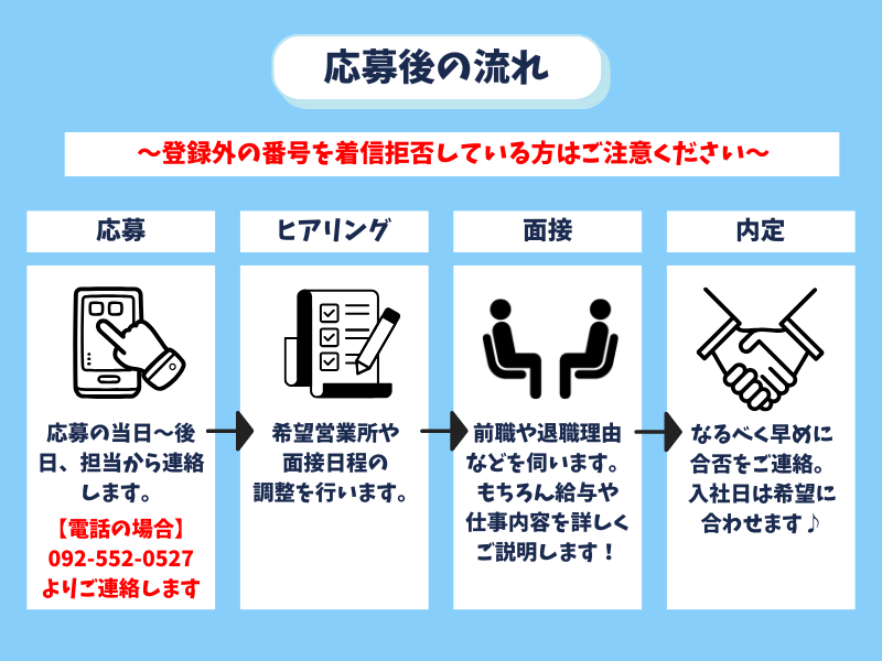 選考プロセス 必要なのは「名前」「生年月日」「連絡先」だけ! ▽1分ネット応募▽ 応募ボタンを押して必要事項入力→”応募する” ・1~3営業日以内に担当からご連絡します ・お電話の場合「092-552-0527」よりご連絡 ▽すぐ選考に進みたい方向けの電話応募 TEL:0120-391-339 ・担当が休みじゃない限り即日対応します◎ (休みのときは1~2日お待ちください…!)