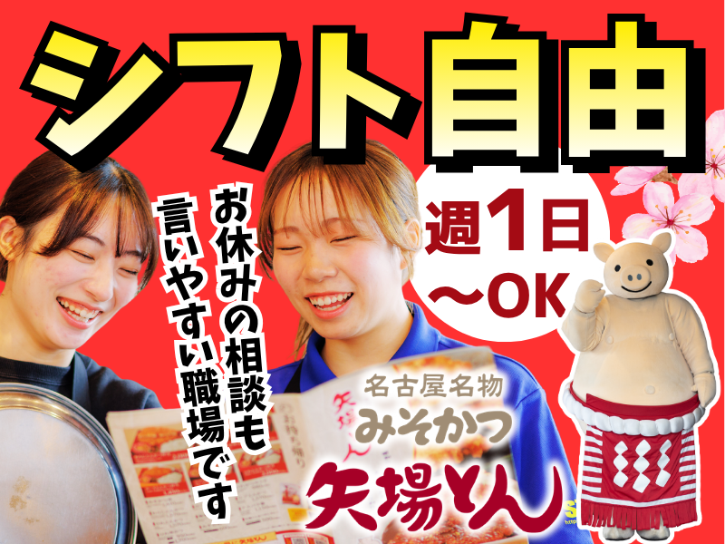 仕事内容 ✨春からのバイトデビューも全力応援✨ ✅男女学生さん活躍中! 空いている曜日で気軽にはじめて 気に入ったら 徐々にシフトを増やすのも自由♪ 出会いもいっぱい☆ バイト仲間から友達に♪ みんなで楽しく働きましょう☆ <おすすめポイント>- ⭐新大学生歓迎!学業との両立も◎ ⭐シフト自由!週1日・1日3時間~OK ⭐美味しい「まかない」無料 ⭐友達と一緒の応募も歓迎 ⭐やさしい先輩が丁寧に教えます - 東海エリアのお客様はもちろん 観光客にも大人気の有名店 「みそかつ矢場とん」で 自分らしく働きませんか☆ ✨フードコートの 「みそかつ矢場とん」で接客販売 <仕事内容> 店頭カウンターで ・注文を確認 ・お料理の提供 ・返却された食器の片付け など。 フードコートなのでお席までのご案内がなく お料理の配膳や返却などは お客様がしてくださいます。 <バイトデビューの方も安心> この春に入学する大学1年生も大歓迎! 大学生の先輩も多いので テストや実習など学校の予定はもちろん プライベートの予定も シフトの融通が利きやすい職場です。 年齢の近い先輩スタッフが 基礎から丁寧にお教えします。 最初はメニューを覚えるところから はじめましょう。 1ヶ月ほどで慣れる方がほとんどです。 <無料のまかないあり> バラエティー豊かで栄養満点◎ みそかつの日もあり 無料で食べられるのでおトクですよ。 一人暮らしの学生さんからも 美味しいまかないが無料で お腹いっぱい食べられ 食費も浮くと大好評です。 社割もあります♪ ★先輩スタッフのコメント <大学生Hさん/20歳・女性> 最初はスポットバイトの単発でしたが スタッフのみなさんがやさしくて お店の雰囲気がとってもあったかい。 1回だけが2回になり 次も…と考えていたら 「いいじゃん、バイトしなよ」と 店長や先輩の言葉に背中を押され 矢場とんに入りました。 バイト同士の仲も良く 仕事以外でも食事に行くことも♪ 「はじめてのバイト」という方も 安心してスタートできますよ。 県外や海外からの観光客の方など 老若男女問わず様々なお客様を接客します。 私は、自分の語学力を使って 海外の人と話してみたいなという 気持ちがあったので それが実現できるところも矢場とんで働く 楽しみのひとつです。 <大学生Kさん/20歳・女性> スポットバイトから 店長に誘われ、矢場とんに入りました。 お店全体に活気があり、忙しい時程 「行くぞ!行くぞ!」と声をかけあって 盛り上がっています。 みんなで一緒に盛り上げるので 応援されている様な気持ちになり 楽しく仕事ができます! お客様から「美味しい」「ごちそうさま」 と声をかけていただくことが多く それぞれの方に合った接客を心がけて います。直接「ありがとう」と 言っていただけた時は最高に嬉しいです。 <本店社員Oさん/24歳・男性> 知人のつながりで 矢場とんでバイトをはじめました。 僕は色々な人と話すことが好きで 旅行も好きなので 国内はもちろん、海外からのお客様も多い 矢場とんはとにかく楽しいですね。 最初は戸惑う場面もあるかもしれませんが 徐々に海外の方との接し方も わかってきますよ。 僕は英語は話せませんが ノリと勢いでいけます☆ 矢場とんの仕事内容は 「恋する飲食業 矢場とん」で検索!