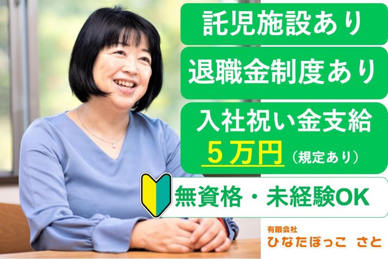 【アピールポイント】 新規スタッフ募集! 無資格・未経験の方大歓迎!ブランクある方大歓迎! ◎入社祝い金5万円支給(規定あり) ●完全週休2日制! ●丁寧な研修・フォローあり! ●退職金制度あり! ●子育ても応援! ・保育園完備 ・保育料の補助あり