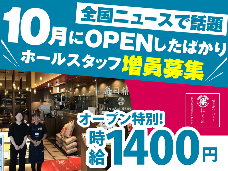 仕事内容 ・・・・・・・・・・・・・・・・・・・・ 10月にOPENしたばかり! 予想以上の大反響の為、増員募集!! ・・・・・・・・・・・・・・・・・・・・ \全国ニュースで話題になりました!/ 国内最高級魚沼産こしひかり食べ放題という 独自の取り組みで、全国放送のテレビに 取り上げられた実績を持つ「にく半」。 新店舗となるイオンモール成田店も、 その話題性と人気を引き継ぐ形で 10月にOPEN! 予想以上の大反響の為、増員募集します! ✅未経験歓迎!アルバイトデビューも☆ ✅週2日・1日3h~OK! ✅美味しいまかないつき✨ ✅今年中だけ時給1400円! ◆ 仕事内容 絶品”板前ハンバーグ”の ホールスタッフを募集いたします! <具体的には…> ・お客様のご案内 ・オーダー対応 ・料理の配膳 ・簡単なドリンク作り ・片付け など \ 初バイトでも安心! / 難しいことはナシ◎ 飲食が初めてでも問題なし☆ にく半はマニュアル完備なので、 安心して始められます! \ 高時給スタートで稼げる! / なんとオープン特別時給として、 今だけ時給1400円!※年末年始連休まで その後も高時給1200円で、 継続して安定収入をGETできます☆ \ 週2日・1日3h〜OK! / シフトは柔軟に調整できるので、 学校・家庭・プライベートとの 両立がしやすいです。 「授業終わりに夕方から」も、 「家事や育児のスキマ時間に」 も大歓迎! テスト期間や子どもの行事など、 ライフスタイルに合わせた 働き方が可能です◎ *…*…*…*…*…*…*…*…*…* <募集背景> にく半 イオンモール土浦店が好調につき、 新店舗「にく半 イオンモール成田店」を オープンしました! 国内最高級魚沼産こしひかり米食べ放題の サービスは、全国ニュースでも 大きく取り上げられ、 その注目度の高さから新店でも 多くのお客様が期待して訪れています。 このたび予想以上の大反響の為、増員募集 いたします! *…*…*…*…*…*…*…*…*…* 【 稼ぎたい方必見♪ 】 希望者は、開店前の ハンバーグの仕込み作業もあります。 (▶08:00~10:00)