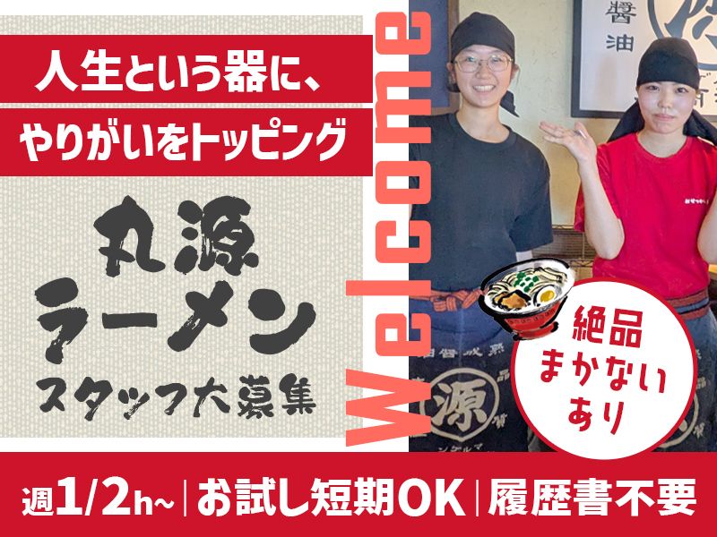 仕事内容 “肉そば”でお馴染みの丸源ラーメンで ホールのお仕事です。 ▽ホール ・お水の補充(ピッチャーづくり) ・お皿/机の片付け ・料理提供 ・レジ など まずは、 「いらっしゃいませ」 「ありがとうございます」 が笑顔で言えれば、OKです◎ 助け合い精神のアットホームで楽しい雰囲気のお店♪ 未経験、バイトデビュー、高校生も大歓迎◎