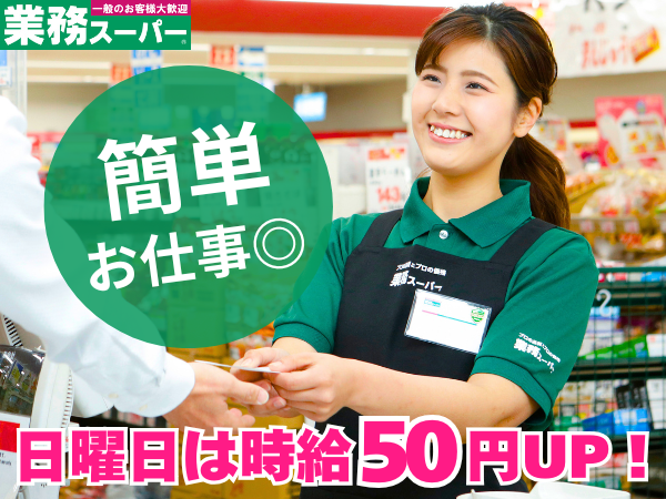 仕事内容 業務スーパー横浜いずみ店で、 レジや品出しなどをお任せします! ■レジ 自動釣銭レジなので返金ミスもなく安心♪ 商品を読込スキャンするだけなので、 簡単業務でラクラク♪ ■品出し 新しい商品をキレイに陳列したり、 目玉商品を目立つように飾ったり♪ 段ボールのまま陳列するので、効率も◎! ■商品チェック 在庫数の確認、 賞味期限や破損などのチェック ■接客 ■清掃 等 🌟バイト未経験の方や ブランクのある方など 幅広い年代スタッフが活躍中!
