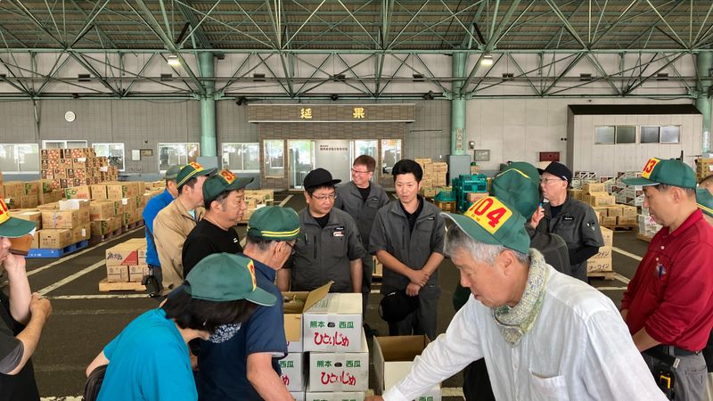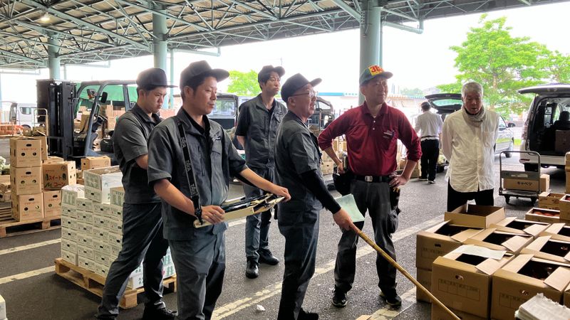 卸売市場内での青果物の販売スタッフ