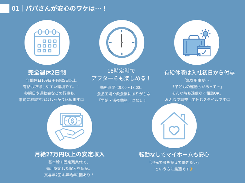 職場環境 \働きやすさ◎/ 「家族との時間も大切にしてほしい」 そんな想いで、職場作りに本気で取り組んでいます。 ✅未経験者大活躍! ✅20代・30代のパパさん活躍中✨ ✅日勤のみ・残業少なめ ✅制服貸与(ポロシャツ・前掛けなど) ✅アットホームな社風◎