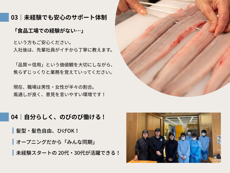 仕事内容 \おかげさまで出荷量増加!工場を拡張します/ 2026年秋、 『株式会社中庄センター』が生まれ変わります。 ありがたいことに依頼が増え続けており、 今の工場だけでは手狭になってきました。 そこで今回、 すぐお隣に「新工場(増築エリア)」を建設! 2026年秋の完成に向け、 体制強化のための増員募集を行います。 あくまで「新しい拠点が別でできる」のではなく、 「中庄センターの敷地が広くなる」というイメージ。 広くなった工場全体を使って、のびのびと活躍してください! ✨中庄センターの魅力ポイント✨ ✅月給27万4000円以上スタート! ✅9:00~18:00勤務で生活リズム安定 ✅完全週休2日制 ✅2026年秋、拡張エリア完成予定✨ ✅将来は工場長などのキャリアパスにもチャレンジできる! ✅髪型・髪色・服装自由 「子どもが大きくなるまでは、 ちゃんと夕飯を一緒に食べたい」 「シフト制で予定が組めないのはもう卒業したい」 そんな想いを持つ、子育て世代のあなたへ。 ここなら、18時には仕事を終えて、 19時には自宅で家族と食卓を囲む ── そんな「当たり前の幸せ」を大切にできます。 ■パパさんが安心のワケは…! ┈┈┈┈┈┈┈┈┈┈┈┈┈┈┈•• 結論… 「生活リズムの安定」×「給与の安定性」 この2つが約束されているから✨ 詳細に関しては… ✅18時退社で家族との時間を確保 勤務時間は9:00~18:00。 食品工場や飲食業にありがちな 「早朝・深夜勤務」はありません。 ※正直にお伝えすると… 2026年10月の新工場オープン直後や、 夏の繁忙期(土用の丑の日)などは、 どうしてもバタついてしまうことがあると思います。 「365日、絶対に定時!」とは お約束できないのですが… その分、落ち着いている時期はサッと帰る。 忙しい時は、チームみんなで助け合う。 そんな「メリハリ」のある働き方を大切にしています。 ✅月給27万円以上の安定収入 ・基本給+固定残業代で、 毎月安定した収入を保証。 ・賞与年2回&昇給年1回あり! ✅休みもしっかり「完全週休2日」 ・無理なく働ける週休2日制。 ・有給も取得しやすい環境です。 ・参観日や運動会などの行事も、 事前に相談すればしっかり休めます◎ ✅転勤なしでマイホームも安心 ・愛知県北名古屋市勤務(転勤なし) ・車通勤OK&無料駐車場完備 ・通勤手当規定支給(上限3万円) 「地元で腰を据えて働きたい」という方に最適です✨ ■具体的なお仕事内容 (チームで助け合うローテーション制) ┈┈┈┈┈┈┈┈┈┈┈┈┈┈┈┈┈┈•• 今回募集するのは、 特定の作業だけを行うスタッフではありません。 あなたにお任せしたいのは、 「鰻加工のプロフェッショナル」としての業務全般です。 あえて担当を固定せず、 「週替わりのローテーション」で全員が全ての工程を経験。 ✅【新エリア】での業務例 最新設備が整った拡張エリアでは、 加工の花形業務をお任せします。 ・鰻の捌き(さばき) ・白焼き加工 ・瞬間冷凍 など ✅【既存エリア】での業務例 全体の流れを支える重要なポジションです。 ・検品、箱詰め ・出荷準備 など なぜ、ローテーションにするのか? それは「特定の人しかできない仕事」を無くすため。 全員がどの仕事もできるようになることで、 誰かが休んでもチーム全体でカバーし合える 強い組織を作っています✨ ▼どちらの環境も快適です!  ̄ ̄ ̄ ̄ ̄ ̄ ̄ ̄ ̄ ̄ ̄ ̄ ̄ 新エリアはもちろん、 HACCP(衛生管理)に対応した ピカピカの最新設備! 既存エリアも、整理整頓が行き届いた清潔な環境です。 どちらも空調完備で、夏も冬も快適に作業ができますよ◎ ■未経験でも「一生モノの技術」を ┈┈┈┈┈┈┈┈┈┈┈┈┈┈┈┈┈•• ローテーションの中には、 当然 「鰻の捌き(さばき)」のような専門技術も含まれます。 「自分にできるかな…」と不安な方もご安心ください。 独自の育成ステップで、一生モノの技術が身につきます! ▼失敗しても大丈夫な「練習環境」  ̄ ̄ ̄ ̄ ̄ ̄ ̄ ̄ ̄ ̄ ̄ ̄ ̄ ̄ ̄ ̄ 当社には、グループ連携による仕入れルートがあるため、 「練習用の鰻」をたっぷり確保できています。 「お客様の商品で失敗したら…」 という心配はいりません。 練習用で自信がつくまでトライできるので、 未経験からでも確かな「手に職」がつきますよ◎ ⭐先輩社員も一緒だから安心! オープニング(増床)といっても、 全員が新人なわけではありません。 既存エリアで経験を積んだベテラン社員も、 一緒にローテーションに入ってサポートします! 「分からないことがあっても聞く人がいない…」 なんてことは絶対にないので安心してくださいね✨