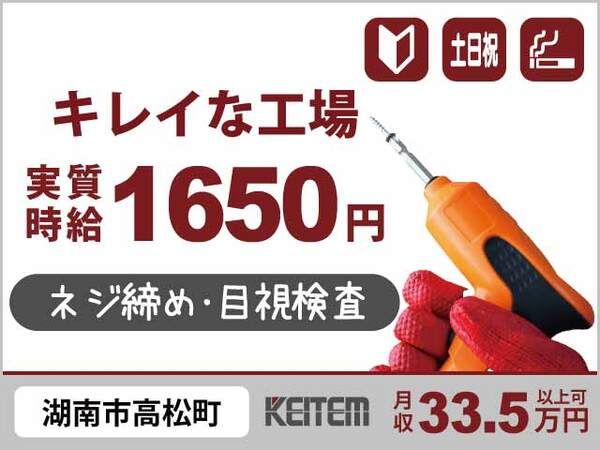 仕事内容 【水処理装置の組立・目視検査】 排水処理に使用される「液中膜」という 液体フィルターと水処理装置を作る工場でのお仕事です。 普段あまり見かけない製品ですが、 水をキレイにするために欠かせない 液体フィルターとその装置を作るお仕事です。 ▼仕事詳細 (1)処理装置にチューブや集合管を取付ける (2)トルクレンチや電動ドライバーで 取付けした管のボルトを締める (3)液中膜の素材を機械にセットして加工する (4)完成した製品を目視で傷や汚れがないか検査する 【求人担当者からヒトコト】 チューブは長い物で155cm程度、 膜の素材は重くても15Kg程度になります。 性別問わずコツコツ・モクモクと取り組む作業が 好きな方におススメのお仕事です。 移転した新工場でとってもキレイな環境です! ・。'.・。'.・。'.・。'.・。'.・。'.・。'.・。 ◆ おすすめポイント ◆  ̄ ̄ ̄ ̄ ̄ ̄ ̄ ̄ ̄ ̄ ̄ ̄ ̄ 【水処理装置の組立・目視検査】 『未経験から実質時給1650円! コツコツネジ締めやモクモク検査』 #月収33.5万円以上可 #新工場でキレイな職場 #土日祝休み #残業月20時間程度 #研修あり #2交替 #車・バイク通勤OK #ガソリン代支給 ・。'.・。'.・。'.・。'.・。'.・。'.・。'.・。 ◆ 職場環境について ◆  ̄ ̄ ̄ ̄ ̄ ̄ ̄ ̄ ̄ ̄ ̄ ̄ ̄ ▽しっかりした研修で未経験の方も安心 製品についてや実際の作業内容などを 入社後の研修で教わります。 時給の変更はありません。 ▽20~40代のスタッフが活躍中 女性のスタッフもたくさん活躍されている職場です。 モノづくり経験のない方も先輩スタッフや社員さんが しっかりサポートするのでご安心ください。 ・。'.・。'.・。'.・。'.・。'.・。'.・。'.・。 ◆ 採用担当よりPR ◆  ̄ ̄ ̄ ̄ ̄ ̄ ̄ ̄ ̄ ̄ ̄ ̄ ̄ (1)未経験OK!時給変動なしの研修があって安心 (2)土日祝休み&長期休暇年3回とプライベートも充実 (3)新工場で空調完備のキレイな職場で快適! ・。'.・。'.・。'.・。'.・。'.・。'.・。'.・。 ◆ 業界未経験者大歓迎 ◆  ̄ ̄ ̄ ̄ ̄ ̄ ̄ ̄ ̄ ̄ ̄ ̄ ̄ 以下の業界での勤務経験のある方も活躍中! ・自動車整備業界 ・物流・運輸業界 ・飲食業界 ・小売業界 ・サービス業界 ・アミューズメント業界 ・インフラ業界 ・ホテル業界 etc. ・。'.・。'.・。'.・。'.・。'.・。'.・。'.・。