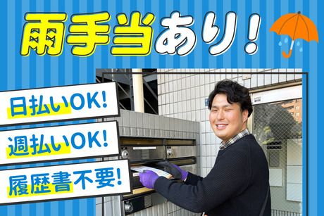 仕事内容 ★ おすすめポイント ★ ★「今週は入れない…」も◎変更相談OK! ★即日勤務◎前日までの連絡で翌日にシフトIN! ★日払い・週払い・月払い対応!(規定あり) ★すぐ働きたい方は”面接ナシ”もOKです♪ ◎学校やWワーク、家事のスキマ時間で働ける! ライフスタイルに合わせてムリなく調整◎ 「急に週末ヒマになっちゃった…」 「授業のない日だけバイトしたい!」 「Wワークとして短時間だけ!」などもOK! ◎働いた分は最短で翌日にGET! 急な出費や金欠時にも安心◎ 「今すぐお金が欲しい!」そんな時も安心♪ <<気軽にできる♪超カンタン3STEP!>> (1)支社でチラシを受け取る (2)担当エリアのマンションや 住宅のポストに投函 (3)支社に戻り配布枚数の報告をし終了 特別な知識やスキルは一切不要◎ ※扱うのはフードデリバリー、塾などのチラシです ノルマもないので 「今日はこのくらいにしておこう」 「時間があるからもう少しやってみよう」 そんな柔軟なスタイルでOK! 移動手段:電動自転車・バイク(無料貸与あり) 報酬:完全出来高制/1ポスト3円~8円 <<履歴書ナシで即スタートOK!>> めんどうな準備は一切ナシ◎ 思い立った日に申請で最短翌日にお仕事デビュー♪ ★「配布担当エリアってどこ?」 →支社の近くがメインエリアです。 ご自宅から通いやすい支社をご案内します◎ ★シフト内で配り切れなかったら? →ノルマがないので勤務時間内に配れる分でOK! << 業界トップクラスのポスティング会社で安心◎ >> *現在、CMや広告で幅広くプロモーション中!* \アトアトポスティング♪/ 公式アンバサダーは 伊原六花さん 注目度抜群です!! https://www.youtube.com/watch?v=xuiO_KxicuY 株式会社アト は、 業界No.1の取扱量&スタッフ数を誇るポスティング会社です。 関東をはじめ、 仙台・名古屋・兵庫・大阪・福岡など全国に支社をもち、 現在 全国に拠点展開中の成長企業です!