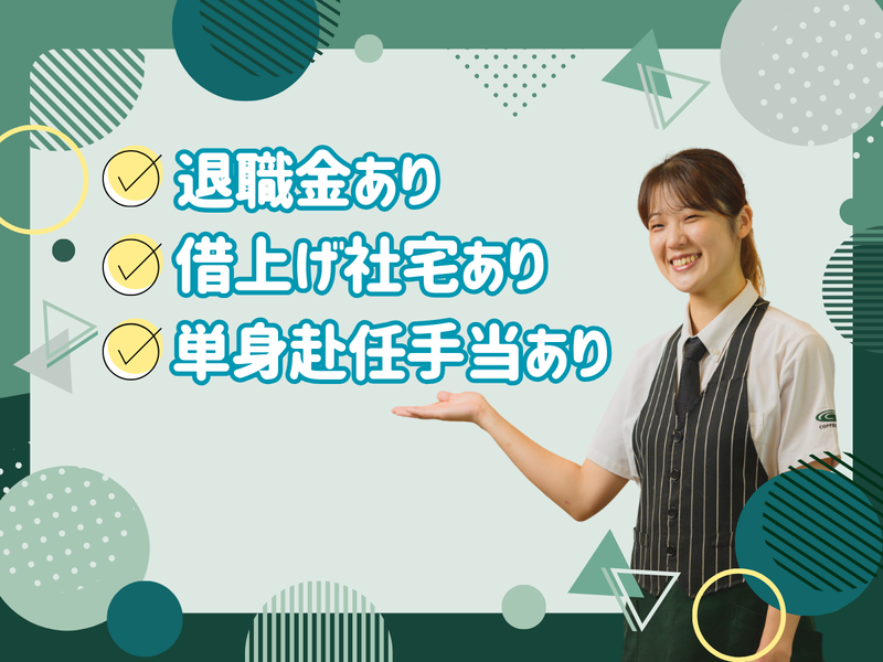 仕事内容 \⭐全国展開のカフェで勤務!⭐/ 今だけ”入社祝い金20万円”支給!(規定有) - - - - - - - - - - - - - - - - - - - - - - ════════════ ⭐ 働く魅力満載! ⭐ ════════════ ⏩年間休日114日/プライベートも大切に ・ウエルカム休暇(入社時に3日付与) ・バースデー&アニバーサリー休暇 ・年2回の5連休 ⏩年収UPも目指せる? ・入社祝い金20万円支給 ・賞与年3回支給 ・単身赴任手当7万円+帰省旅費支給 ・退職金制度あり ・食事補助あり ほか、長く働ける制度が充実◎ ════════════ ⭐ 教育制度 ⭐ ════════════ 入社後3~5日の研修で、 コーヒーの淹れ方や 接客の基礎をイチから学べます! 配属後もマニュアル&定期研修で安心! 社内資格が取れる【珈琲大学】も新設され、 より専門的な知識も身につきます◎ ════════════ ⭐ キャリアアップ ⭐ ════════════ 未経験でも最短2~3年で店長に! 店長・SV・統括MGRなど、 多彩なキャリアが目指せます。 - - - - - - - - - - - - - - - - - - - - - - 【具体的な業務】 ✅接客業務 └ホールでのお客様対応 └レジ ✅キッチン業務 └コーヒーなどドリンクの作成 └簡単なフード調理 ✅店舗事務作業 などの業務をお任せします◎ //━━━━━━━━━━━━ ✨ カフェ事業部 SVの先輩社員の声をご紹介✨ ━━━━━━v━━━━━━// 新卒入社でイタリアンレストランの チェーン店に入社しました。 体力的に結構きつかったのと 別の業界に興味があり転職をしたのですが、 飲食での経験が辛かったけど楽しかったなと 離れてみてわかり、もう一回チャレンジして みたいなと思い、当社に転職をしました。 店長時代は、自分が変われば店を変えられる という部分がありますが、SVは店長を介して 店を変えなければいけないため、 行き詰った時期もありました。 そこで『人の心を変える』というやり方を 会社の研修で学び、それを実践したところ 店舗が変わっていく様子が実感でき 非常に学びになりました。 当社は研修制度がすごくしっかりしていて 常に学べる環境です。 日々自信の成長できることがたくさん あるので、仕事のやりがいにも繋がって おり、その点がとても魅力的な場所だと 感じています。