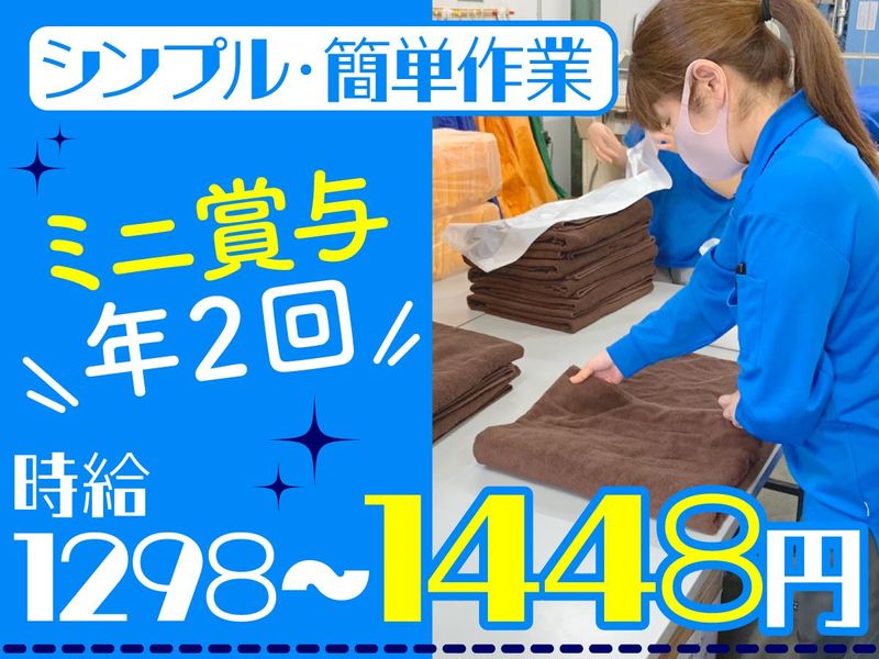 仕事内容 ✧・━・✧・━・✧・━・✧・━・✧・━・✧・━・✧ 衣類やタオルのお洗濯を行う工場内作業 日曜休み・主婦(夫)さん活躍中! 【★有給休暇取得推進★】 日曜日はお休み! ✧・━・✧・━・✧・━・✧・━・✧・━・✧・━・✧ 【仕事内容】 ■乾燥後の仕上げ、ラッピング ■クリーニングの仕上げ ■出荷準備 機械で乾燥→たたむ→袋に詰める シンプルなお仕事! すぐに覚えられる内容なので、 未経験でも安心です! ✅週3日~OK ✅日曜休み/土祝勤務できる方歓迎! ✅未経験・ブランク明けの方も大歓迎 ✅自転車通勤OK/近隣の主婦(夫)さん活躍中 ✅ミニ賞与年2回 ✅祭日/時給1448円 ――――<交通アクセスなど>―――― 今働いている人は 近所の主婦さんが多いです! 皆さん自転車や徒歩で来ています。 ――――<お休み充実!!>―――― 日曜日定休☆週3日~勤務OK! 曜日は相談の上決定したいと思っています。 ★当社は有給取得を推奨! 働く時は働き、休む時はしっかり休む。 メリハリのある働き方が可能です。 *――*――*――*――*――*――* ✨がんばりはしっかり還元✨ お給料とは別に、年2回のミニ賞与あり! 「助かる♪」「うれしい♪」と好評です! 少しでも興味があれば、お気軽にご応募ください! まずは話を聞いてみたい、という方も大歓迎です! TEL/070-6453-5037 電話での応募も受け付けております! 「求人を見ました!」とご連絡をお待ちしております♪ *――*――*――*――*――*――* <アールエスエスグループ> 創業 昭和39年 従業員 470名 健康経営優良法人取得/顧客数1万4500件