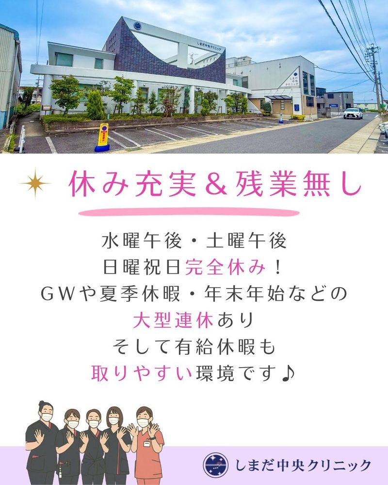 休日休暇 水曜午後・土曜午後・日曜・祝日 GW・夏季・年末年始休暇 有給休暇 ※医院スケジュールによる