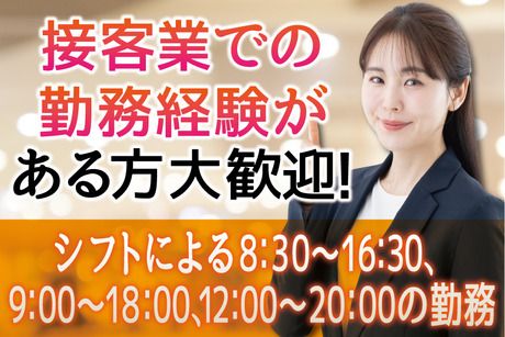 資格 ・土日祝に勤務できる方は大歓迎! ・どの曜日でも勤務可能な方 ・未経験OK ・お仕事復帰、ブランクOK ・接客や販売・サービス業などの経験がある方歓迎 【 こんな方にオススメ 】 ・アパレルショップや食品、スーパー、雑貨屋などでの勤務経験がある方 ・販売スタッフ、接客販売の経験がある方 ・カフェやレストラン、居酒屋などの飲食店でホールスタッフの経験がある方 ・受付や案内スタッフ、食品などの販売、その他サービス業や接客業の経験がある方 ・正社員や契約社員、パートやアルバイト、派遣社員として働いているが、新しい職場に挑戦したいと考えている方 ・ブランクがある方、フリーターの方もOK